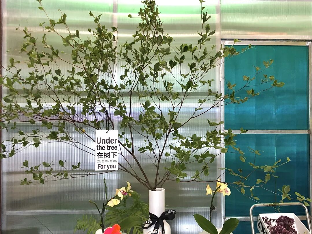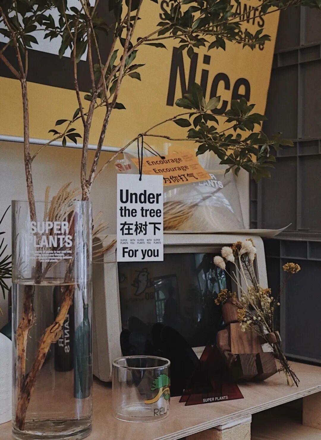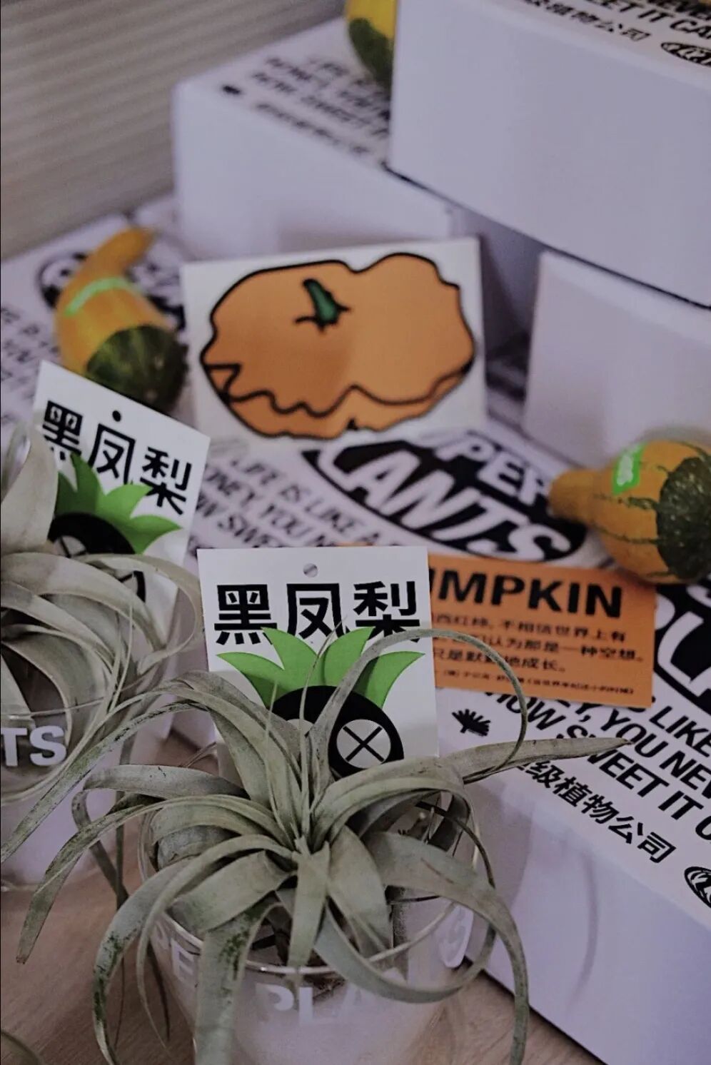 “在树下”“搞快点”“拔草”“黑凤梨”…这些粗体的LOGO就像每株植物的个性“宣言”,在清新的空间中无声地喧哗着,好不热闹。