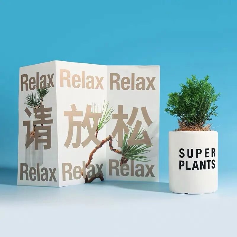 它们所有的产品都脑洞清奇:以雾松黑松等盆栽为灵感的“请放松Relax=放青松”系列;把干花放进充气透明袋里的“为爱打气”和“膨胀”系列;还有把海藻球泡在易拉罐里的“水货”系列……