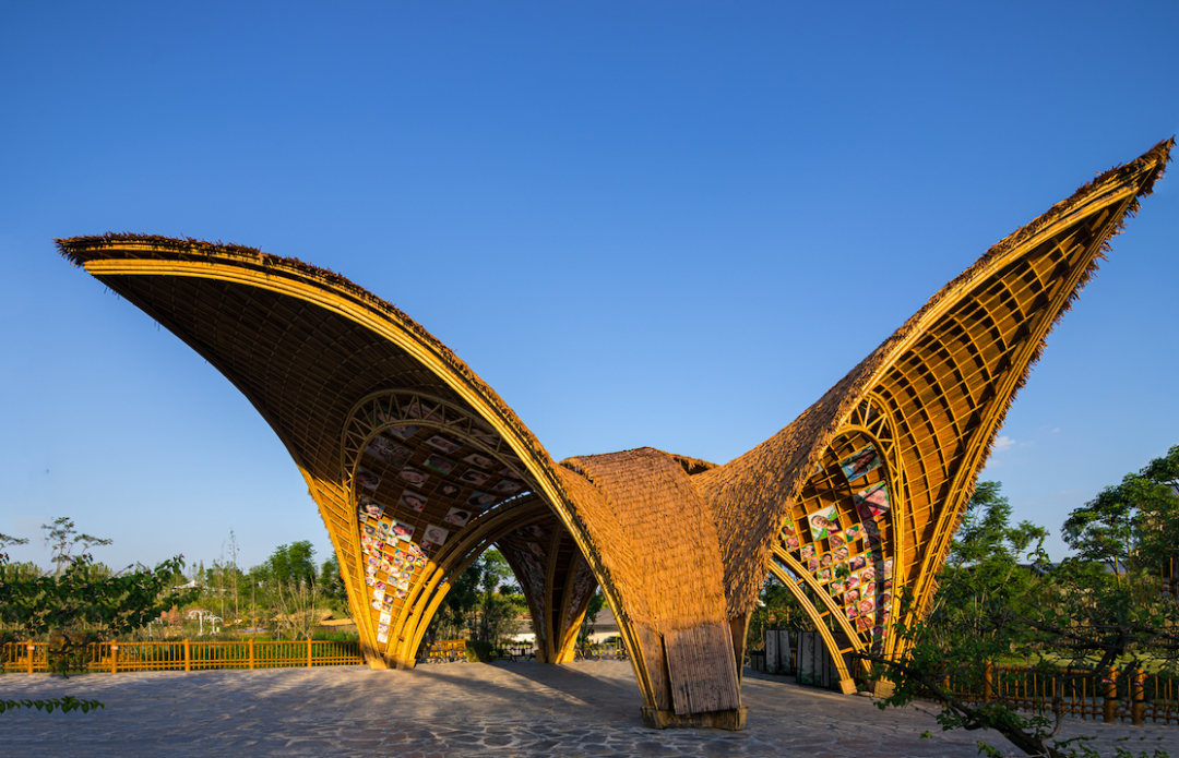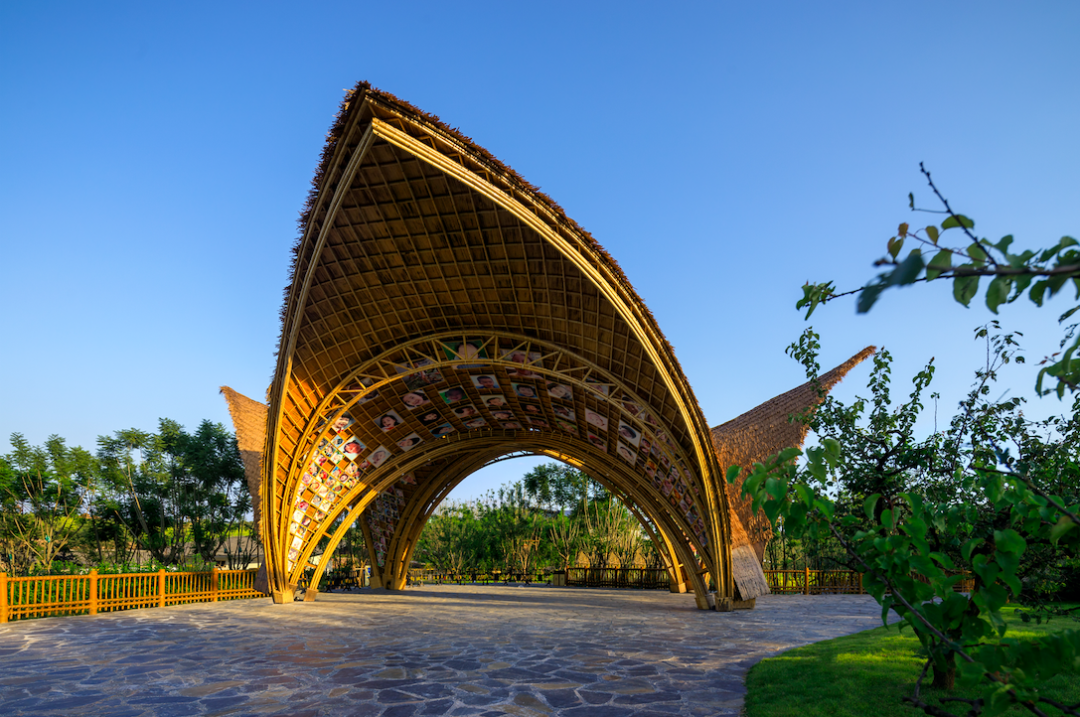探险首先从“种子乐园”入口处的竹艺大门开始。造型别致的巨型竹门就像一顶倒放的大草帽,顶部贴满了孩子和辛勤耕作的农民们的笑脸。