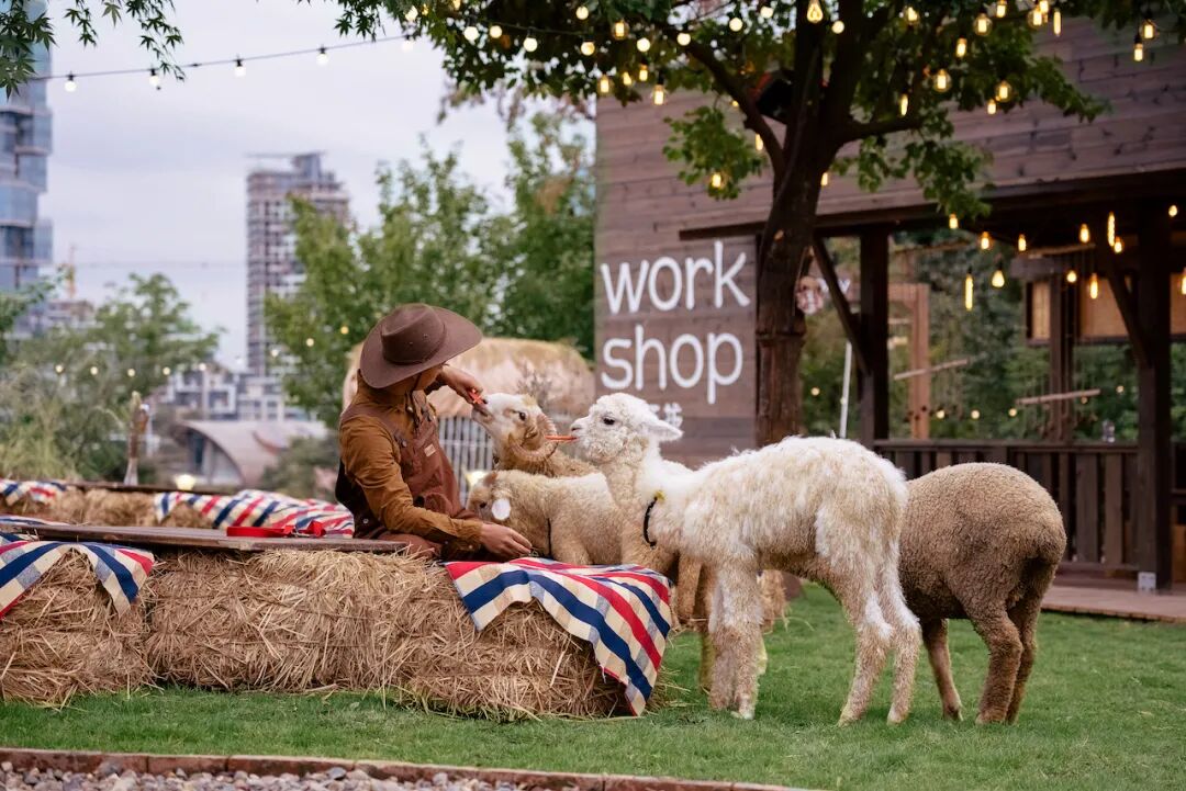 从搭建到布置,动物农场的一切都尽量依从自然本身,以原木色为主的设计,与周围景观融为一体;青草和稻草的清香交融,是自然最原本的味道;草垛、木棚、货车、手推车等元素的组合,展现美式农场风貌。