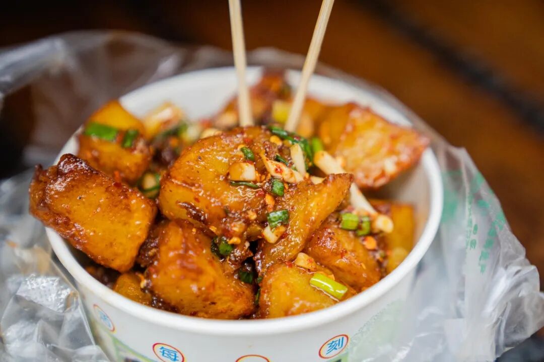再顺着华兴上街往邮电局大楼走去,扎根已久的推车小吃“狼牙土豆”也是一绝,这家的锅巴土豆先过油,把握火候煎至熟,半焦半嫩出锅,再过油炸,撒上老板独家秘制的辣椒面,咬下第一口脑海中只有两个大字“鲜(xuan)香”。