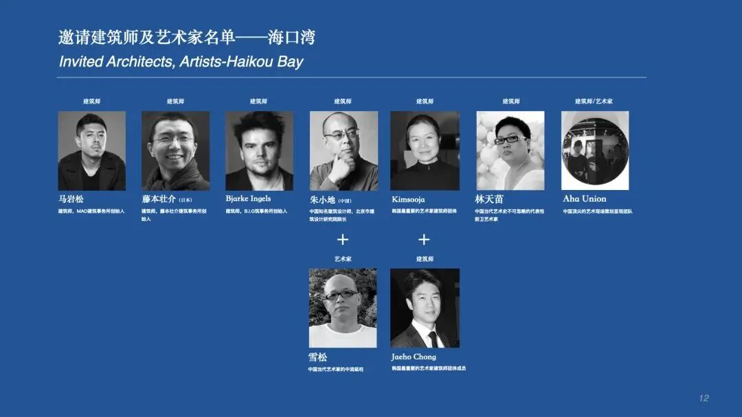 · “海口·海边的驿站”启动仪式:左起艺术家张培力、BIG代表陈曦、MAD合伙人Hayano Yosuke、MVRDV代表Steven Smit、建筑师朱小地、艺术家林天苗、海口市副市长冯鸿浩、项目策划人翁菱、城市规划专家孙继伟、海旅投集团有限公司党委书记、董事长林文伟、建筑师马岩松、建筑师刘家琨、艺术家雪松、Stefano Boeri代表Cecilia Picello、建筑师刘硕