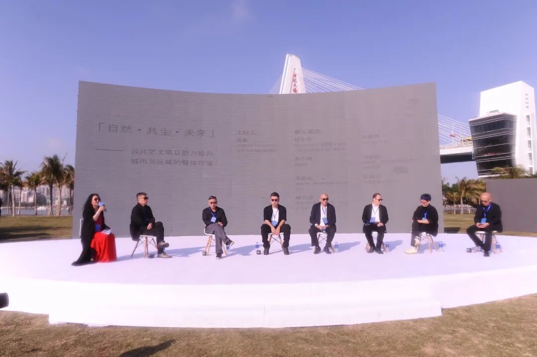 · “自然·共生·未来”专家论坛现场:左起总策划人翁菱、建筑师刘家琨、城市规划专家孙继伟、建筑师马岩松、艺术家张培力、海旅投集团有限公司党委书记/董事长林文伟、艺术家林天苗、建筑师朱小地