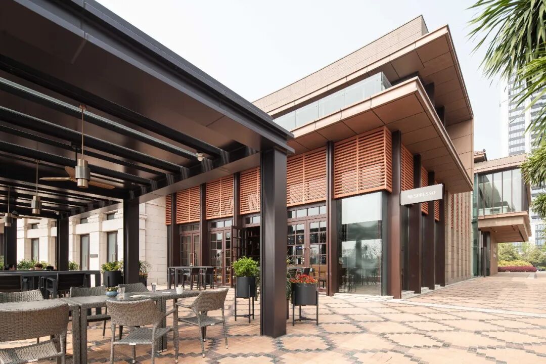 这个有着双重惊喜的“宝藏”咖啡店,就是咖啡图书馆,作为花园城国际度假中心(以下简称“花园城”)湖滨商业街的一部分,咖啡图书馆从外观上看与周围建筑并无不同,唯有高出湖面一层的巨大露台十分惹眼。