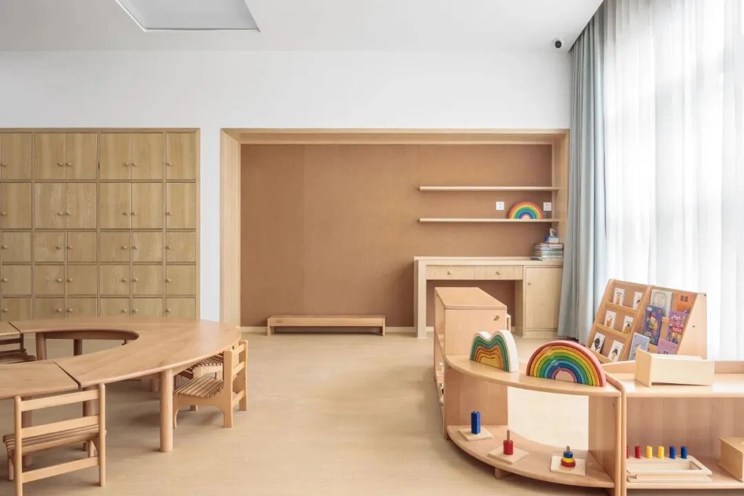 春天里幼儿园设计师灯灯说:“在设计的时候,我们会确保空间尺度和设计布局足够开阔,让孩子们更舒适,材质、色彩选择贴近自然的,带来柔和感和亲和感。”