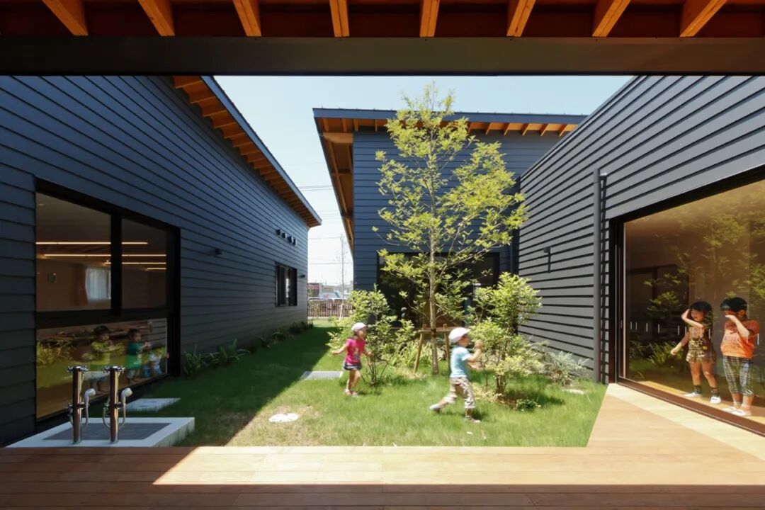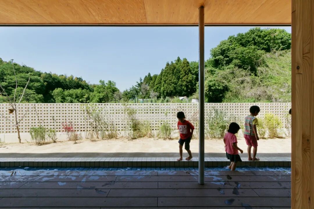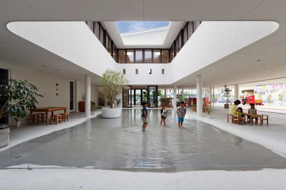 例如日比野设计的位于日本熊本县的D1托儿所,他大胆地取消了屋顶,让建筑中央变成了露天天井,孩子们可以在这里打球、奔跑锻炼身体,还能直接感受到阳光的沐浴,或者雨水的眷恋,到了冬天,甚至可以在这里滑冰。