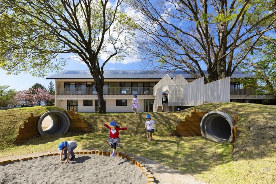例如迪卡幼儿园设计中心设计的大乐之野幼儿园,在外观创新上做了更多自然的思考,孩子们在这里就像蚂蚁进洞穴,与自然融为一体。