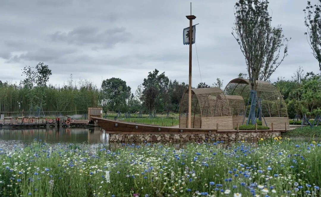 诗里田园利用河道的地理生态,再现了曾经的码头文化。艘艘木船并列河中,绿油油的水稻大田延展开去,将人的视野拉伸到更远的地方,而用船只设计的景观装置,也成为稻田风景里的独特点缀。