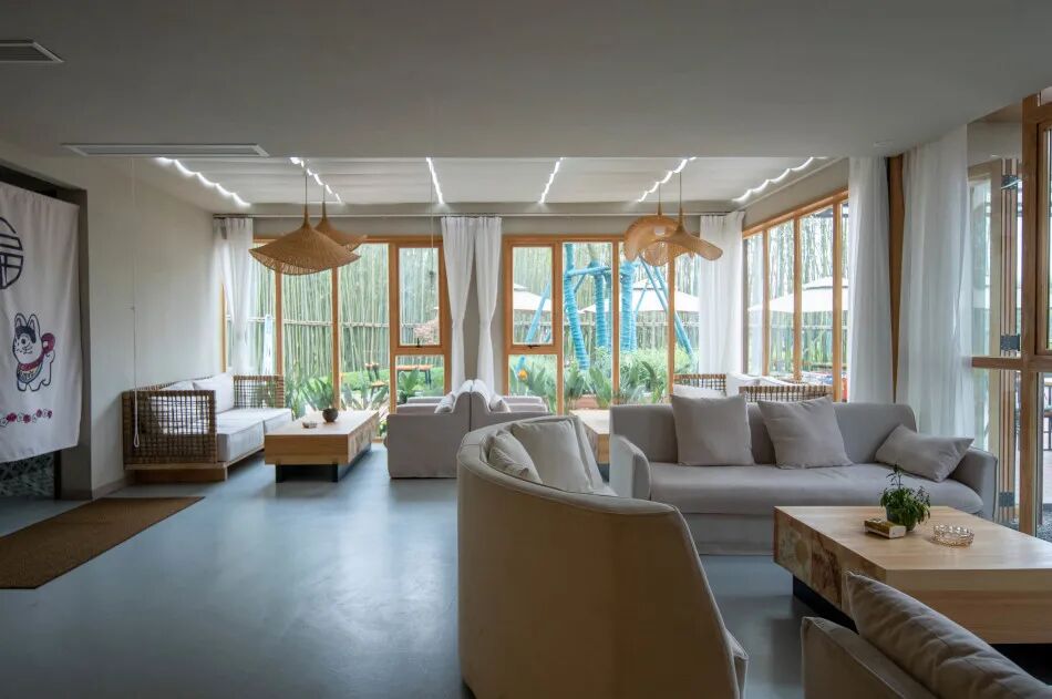 7000多平的草坪区为大人和孩子们撒野提供了广阔的天地。除开常规的团建、烧烤、露营、篝火晚会等活动可以在此开展外,还有爬网、沙池、卡丁车等游玩设施供儿童游玩。可以进行手工课、植物拓印、活字印刷术等文化活动的三角木屋,也为亲子交流提供了好玩的场地。