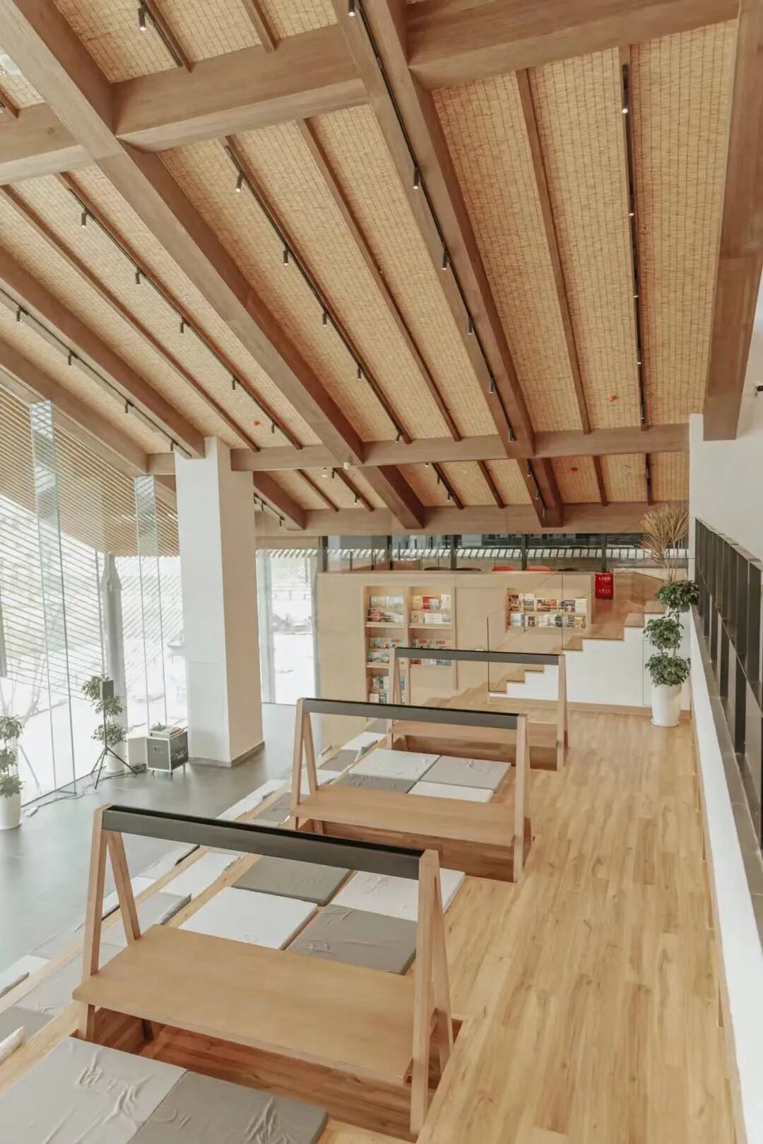 斜坡式的设计,台阶层层往上递进,每一层空间都有明确的主题和功能,也有不同的座位设置,满足闲坐、自习、聚集看书等不同人的需求。虽然看似“浪费”了部分空间,但配上大面积的落地窗,外面的风景一览无余。人们虽然是坐在房间内阅读,却有一种置身田野的“错觉”。