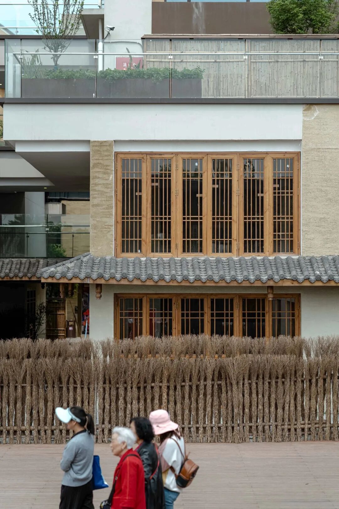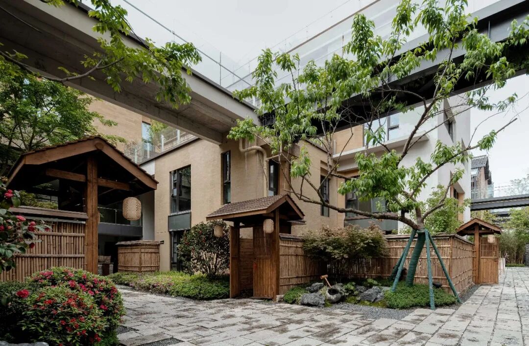 此外,试图挖掘本地文化的内蕴也是诗里田园关注的重点。除开对原有河道、田园的保护和利用外,入口处的竹林隧道也花有心思。它们并非工厂制品,而是由融合了传统非遗手工艺的竹编制作而成。整个制作过程经历了形态打样、40天人工编织,以及炭化烘烤才得以完成。而部分建筑外墙采用仿夯土的涂料,也是为了呼应川西群落文化气息。