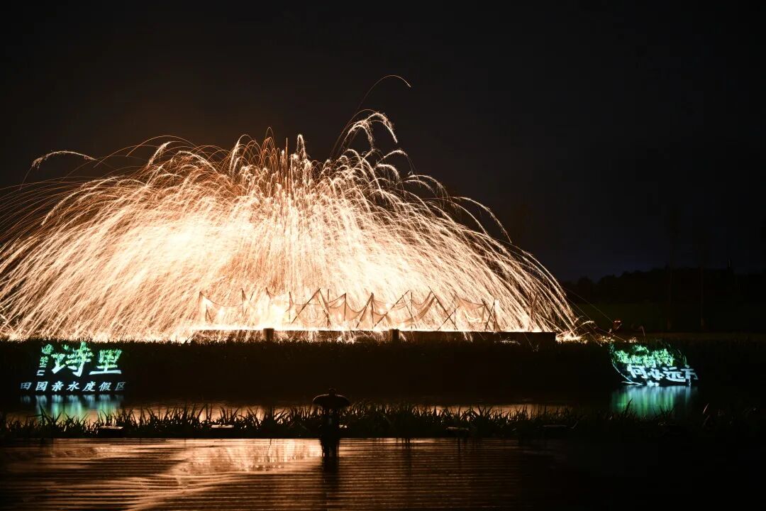 而民谣音乐会、篝火晚会,尤其是作为非遗文化代表之一的千年铁花秀,让夜里的诗里田园成为一个五彩斑斓的世界。