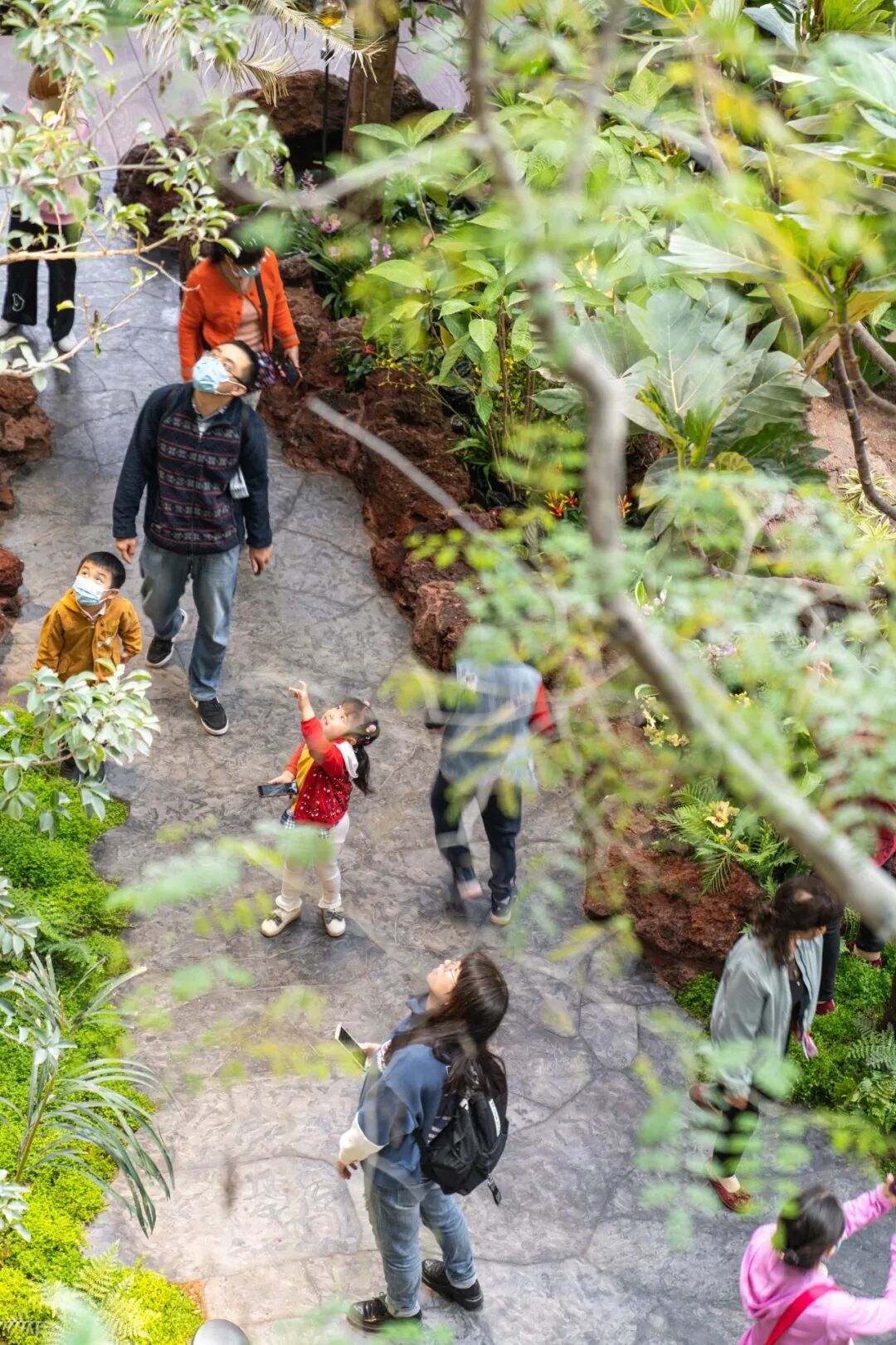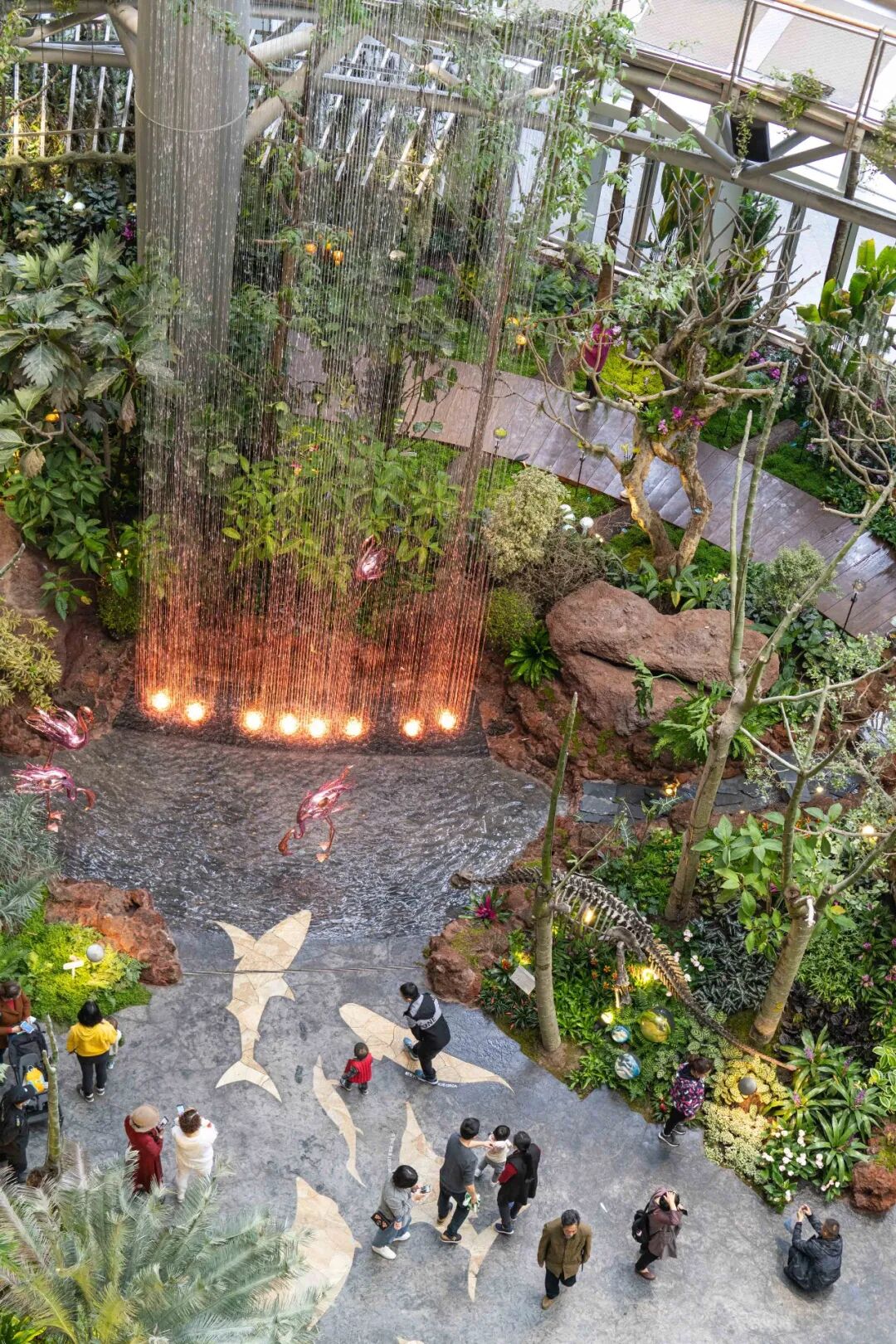 这个总高42米的垂直“室内森林”,是西南首个购物中心室内的温室植物园,引入了包括凤凰木、篦齿苏铁、桫椤等十大珍稀植物,总共有近300种热带和亚热带雨林植物及生态物种,呈现5种自然雨林现象。