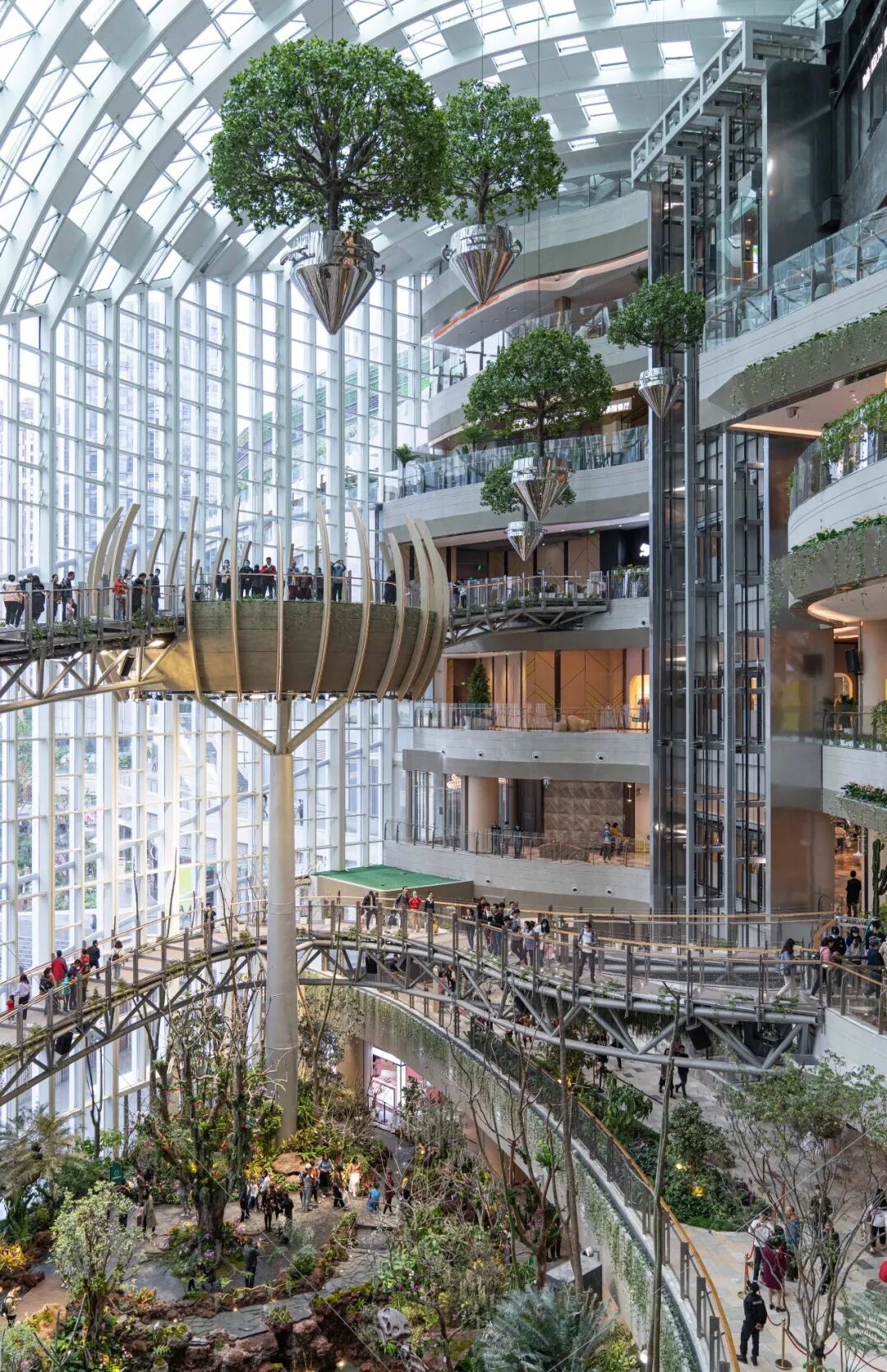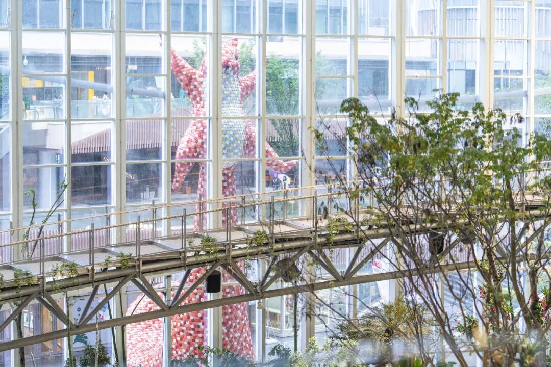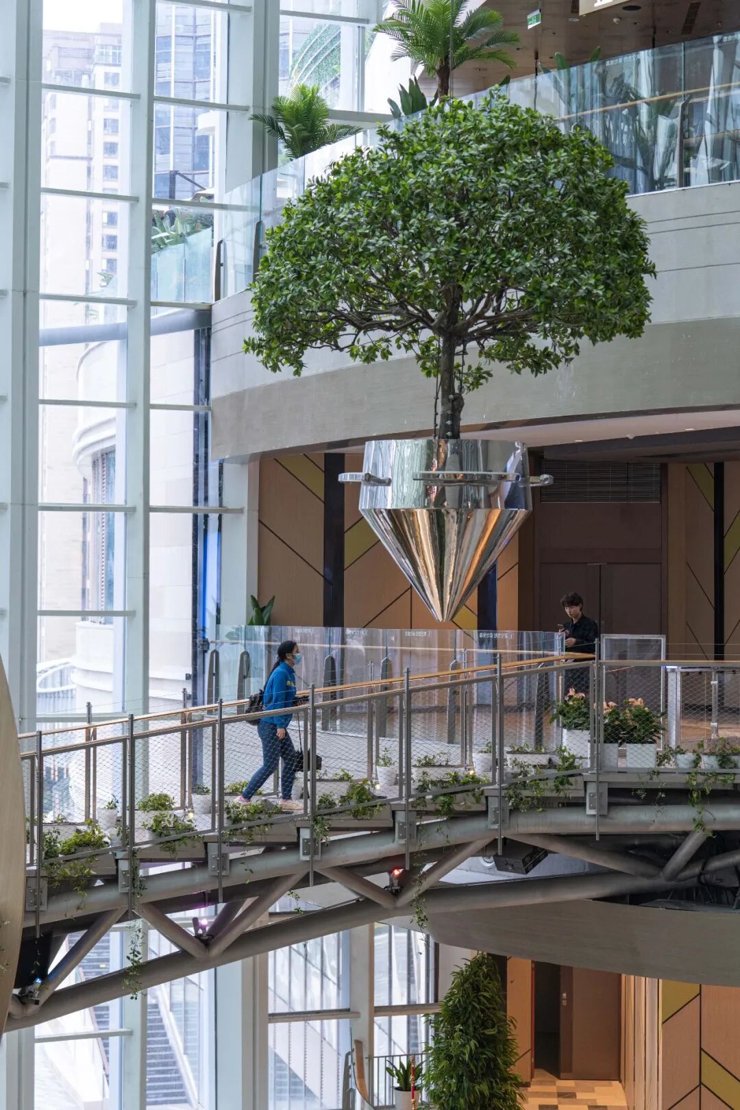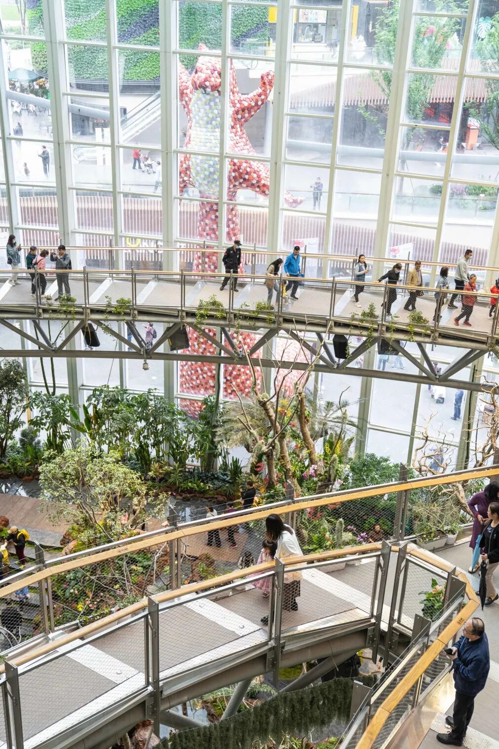 而42米高穹顶打造的大尺度植物园空间,以及悬空其中的步行栈道,则构成了商场视线与人流的聚焦点,当然现在也是最热门的“打卡点”。垂直森林里的悬空跨层步道,则无缝衔接商业与森林,带来在自然中购物的奇妙体验。