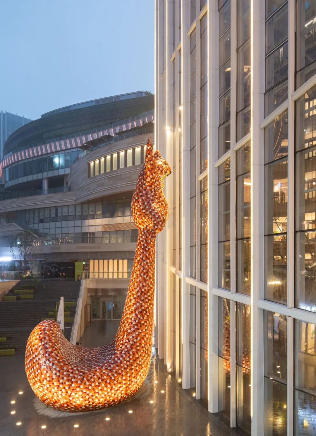 首先是联合荷兰公共空间大型装置艺术家弗洛伦泰因·霍夫曼打造的雕塑IP“松鼠闪闪”,这也是霍夫曼在重庆的首个艺术作品。松鼠闪闪由16500片特制彩色金属片组成,在不同的光线下会反射出不同的光芒。
