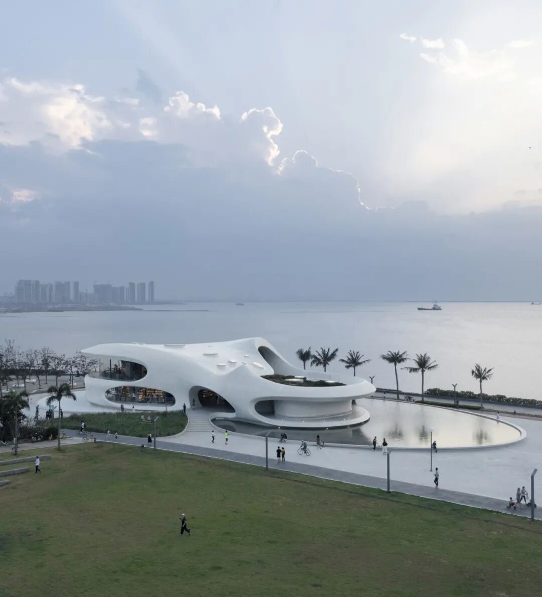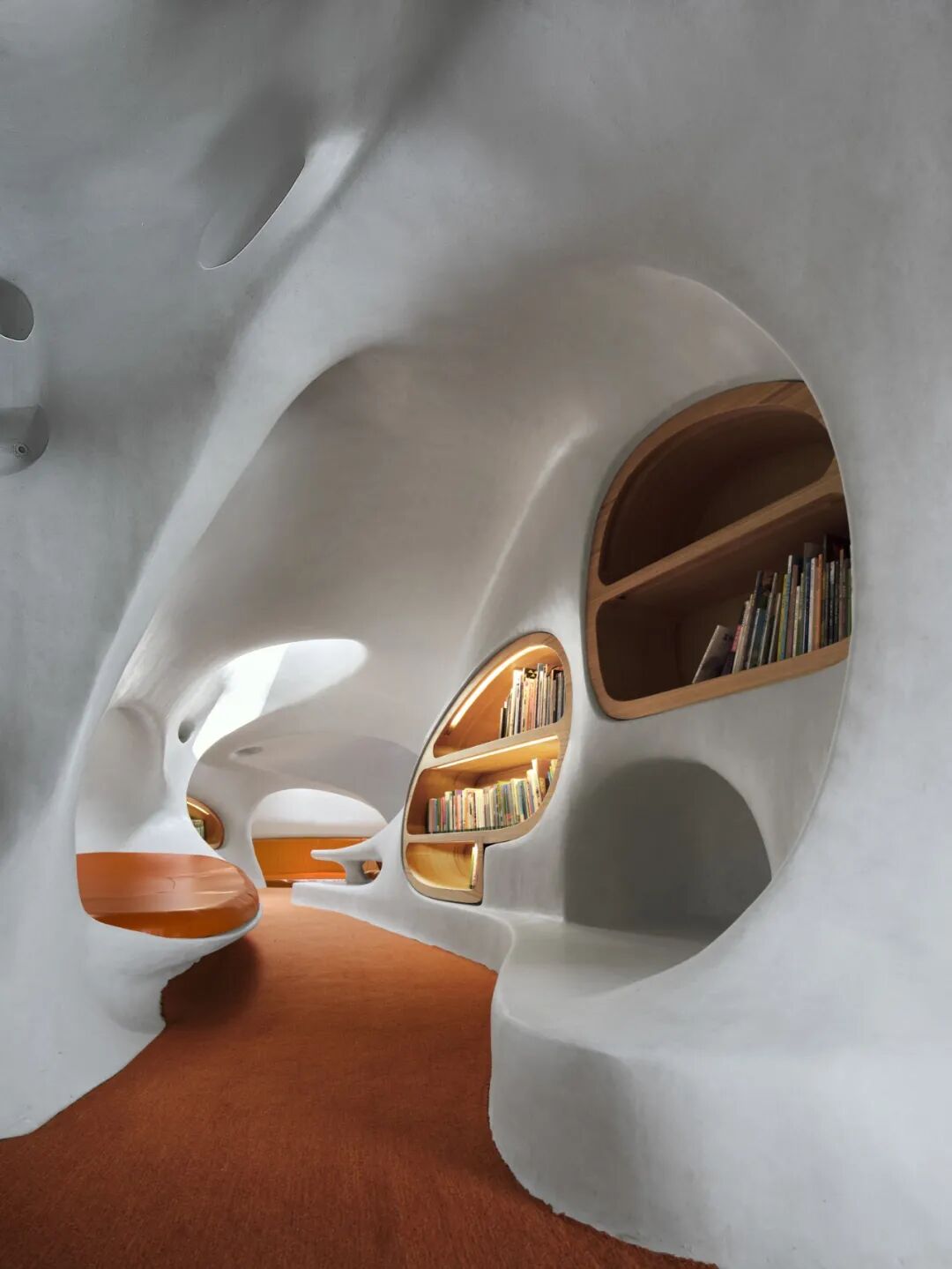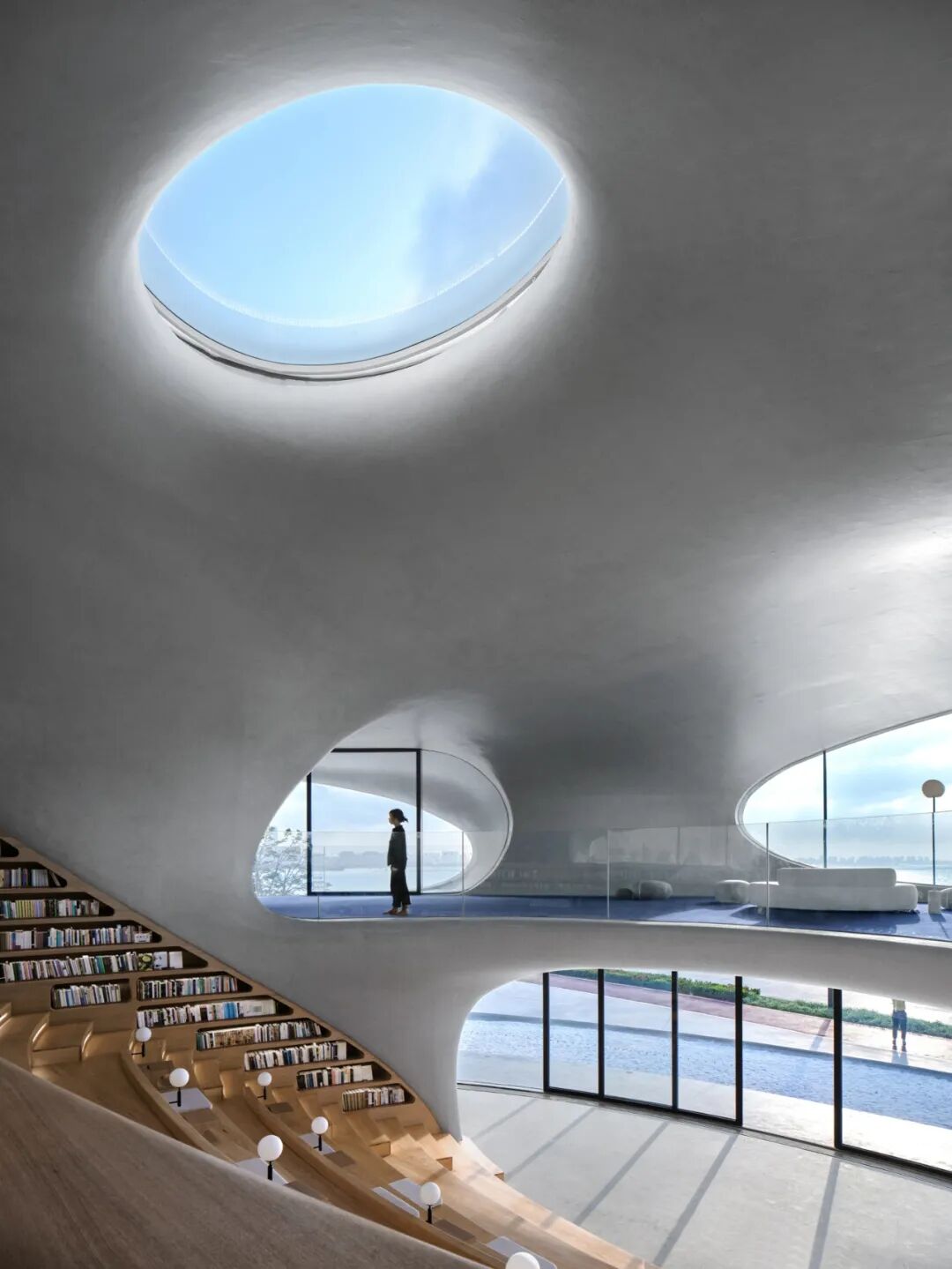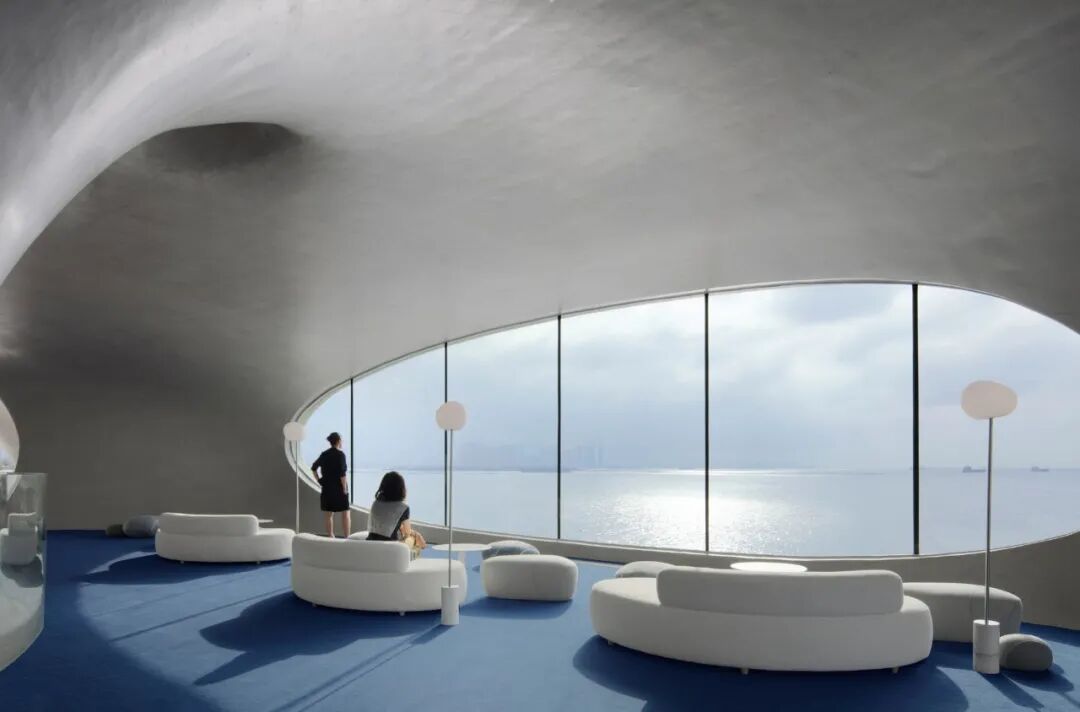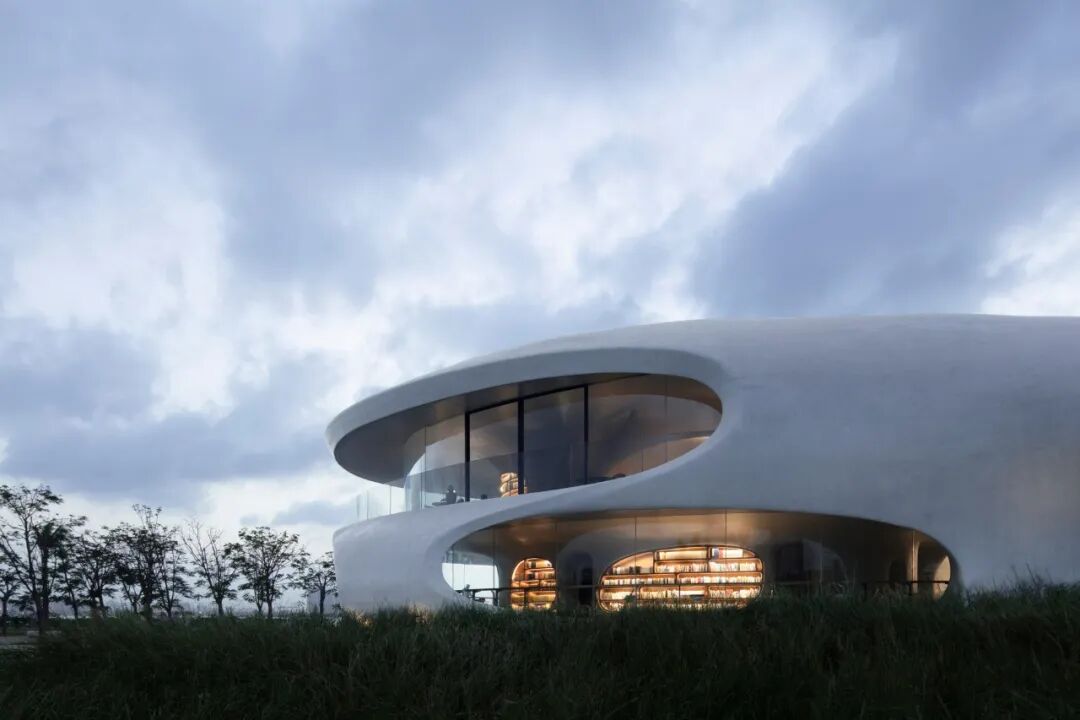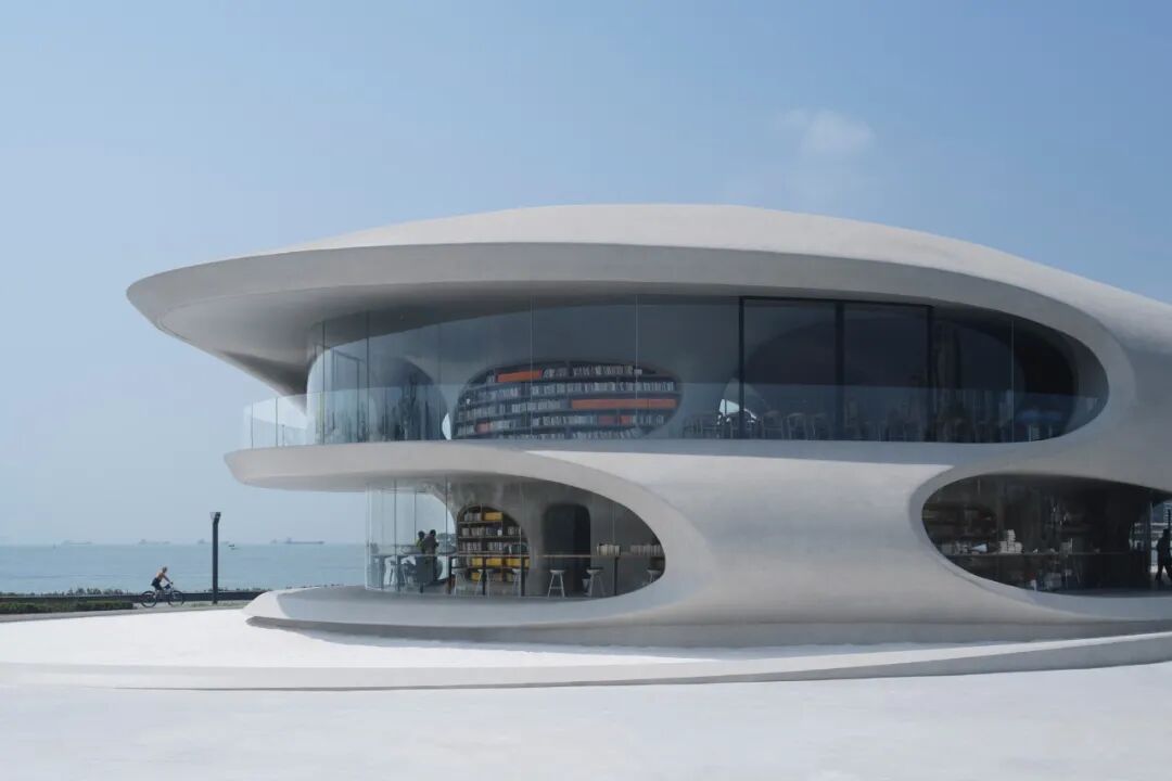 云洞图书馆是一个集图书馆和滨海步道驿站功能的为一体的公共空间。建筑造型以“洞”为概念,流畅顺滑的线条,圆孔和弧形的形状,让一个用混凝土浇筑的建筑变得十分柔和;不同位置打开的洞孔,让天景和海景“掉”进室内,来自外面的声音也随之“流淌”进来;而交错的墙面、楼板、天花失去了分明的界限,加上室内的电器全被巧妙“藏起来”,整个空间视觉上特别干净,给人一种置身外太空的体验。