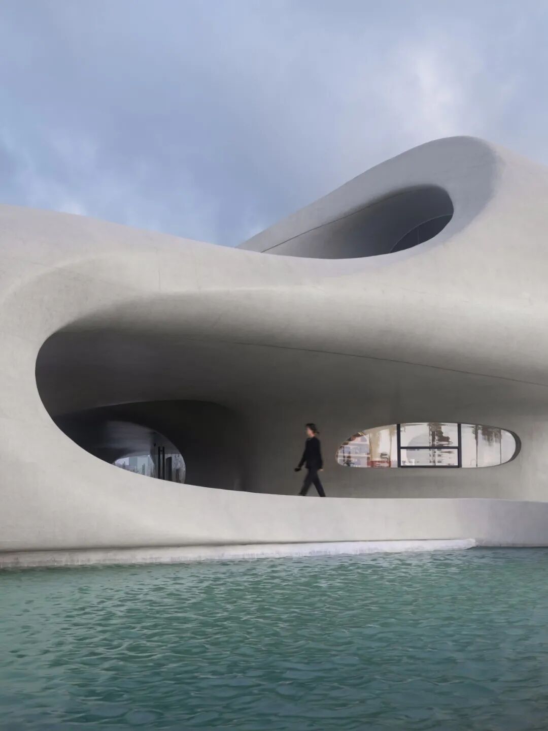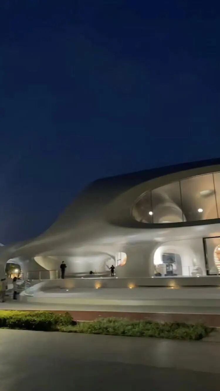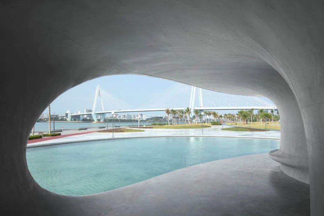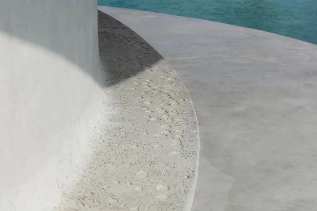 比如下面这张,拍的是户外供人休息的公共座位区。建筑的其他立面光滑得可以说是毫无瑕疵,为了呈现这种“光滑柔顺”的感觉,施工技术难度是一项巨大的挑战。据相关报道,建筑室内外为清水混凝土分段多次浇筑为一个整体,设计深化阶段全部基于数字化模型,对技术要求很高*。
