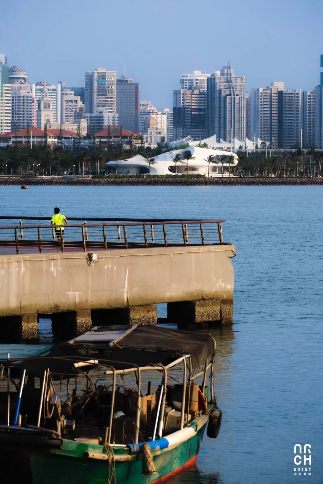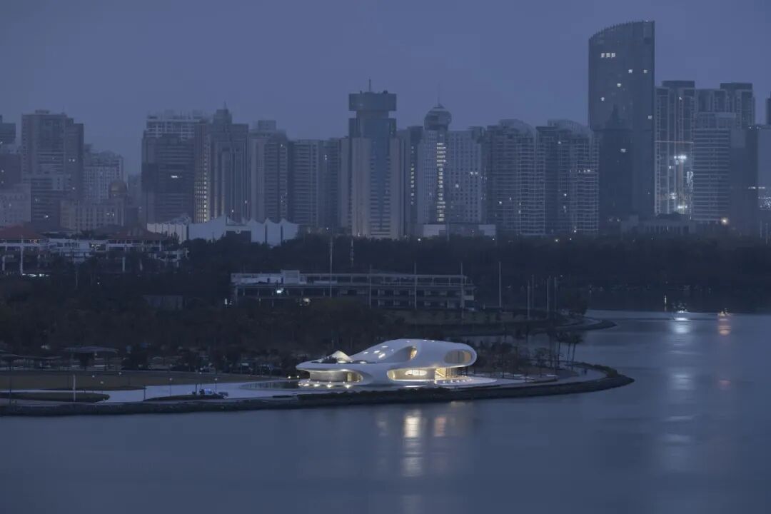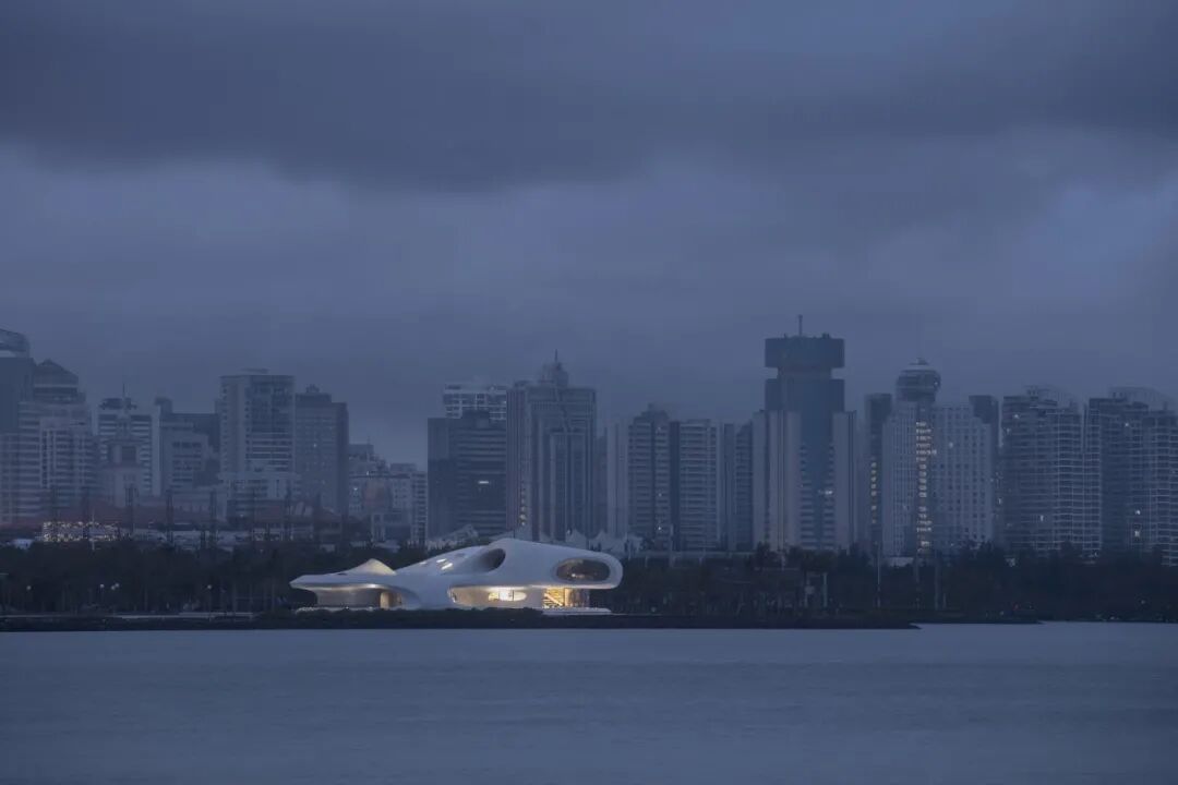 “我们为了得到清晨时的一个场景,就在那里住了一晚,第二天起得很早。当时晨光熹微,城市没有亮多少灯,没有太多人工光线的干扰。”在这张照片里,远处的城市还没醒来,图书馆的灯光亮着,海口与图书馆的关系形成强烈的对比,建筑像来自外太空的飞船停在海边。