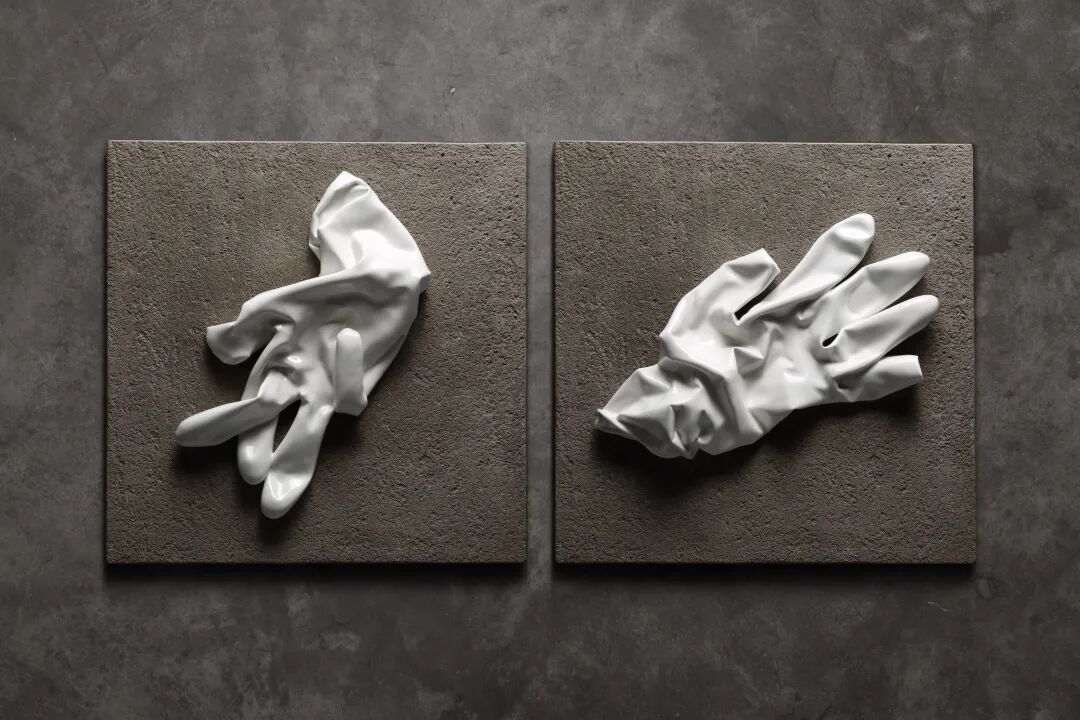 它们均由普通的镁质瓷完成,如果不走进触摸、感受,可能都难以想到它们的材质是坚硬易脆的陶瓷。手套薄如蝉翼,随性的褶皱中带有复杂的情绪,让人难以定义它们到底是谁的手套,医生的?工人的?展现的情景像是被定格的一个瞬间。虽是手套,但林冰却给它取名《皮囊》,名字又引发人另一重联想。手套的皮,也象征着人的皮囊。生命由躯壳包裹,终究不会无坚不摧,而瓷器的易碎正好暗示着生命的脆弱。