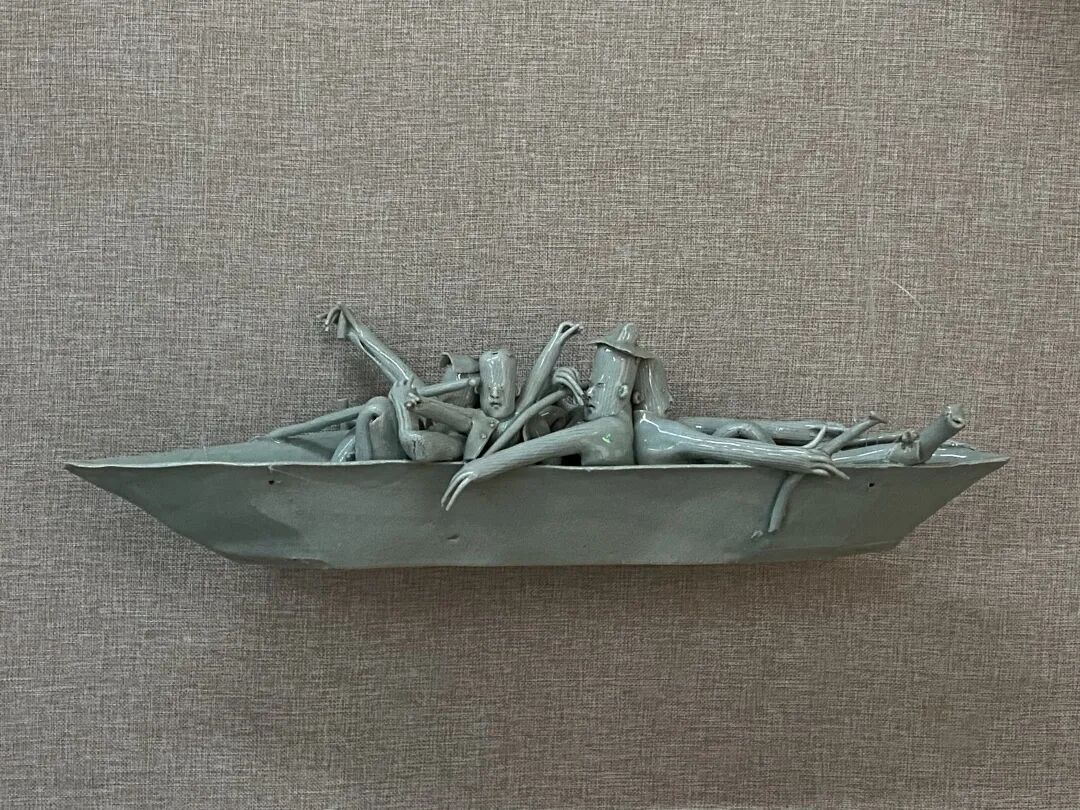 天真、童趣、乖张的特色,极具表现力的造型,却完全由传统的青瓷技艺来表现。潮州“大吴泥塑”,被誉为“中国三大泥塑”之一,他创造性地化用了泥塑的手法,让瓷器展现出柔如泥巴,柔若绸缎的特点。而取自传统文化中的龙、船、荷叶的形象,也被巧妙地融入到作品中。如果不是见到艺术家本人,都难以想到这么稚拙可爱的形象居然出自一位60后。
