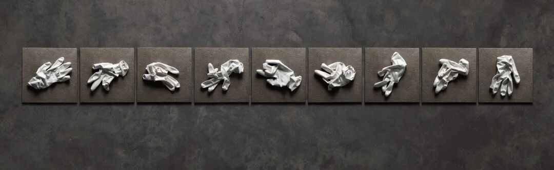《皮囊》。手套是他常见的事物,做陶瓷喷漆时会用到手套,医生会用到手套,他把这些所见化为艺术。图片由艺术家本人提供