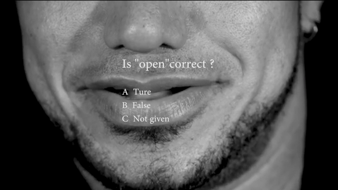 安斯在外留学期间,在非中文的环境里感到了身份认同的危机,英语成了她的使用语言。“不同国籍、种族的人都使用英语,于是就想到用英语来创作。”作品TURE?FALSE?NOT GIVEN让不同国家、肤色、性别的人对着摄像机说同一个词OPEN,“希望观者在看作品的同时能够思考OPEN发音、内涵的正确性。”