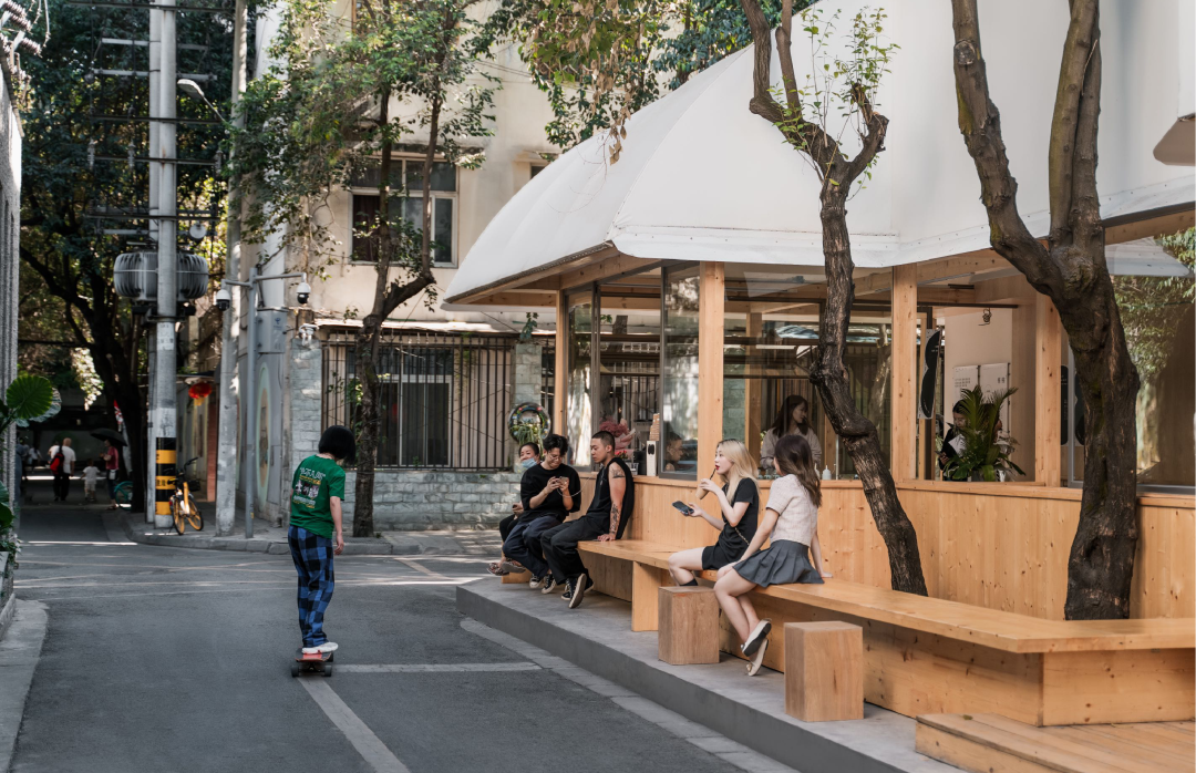 巷子里采用了凹凸错致的平面布局,让空间内部几乎没有视觉死角,在热闹中萦绕着适度的安全感和距离感。室内室外发生关系的立面处理,外部的座位设计,保留的树木所产生的趣味,让陌生人之间也能够轻松地交流起来。