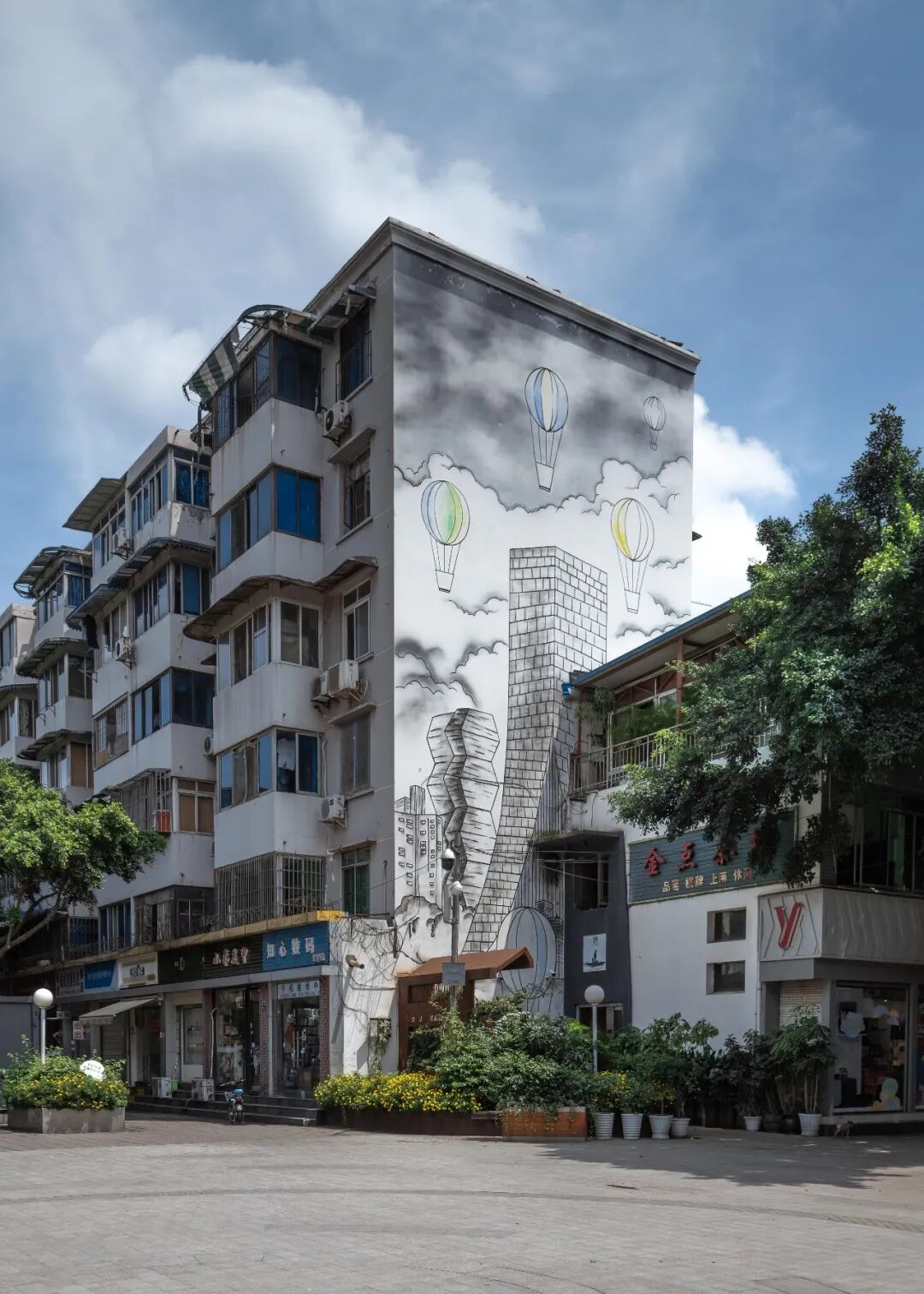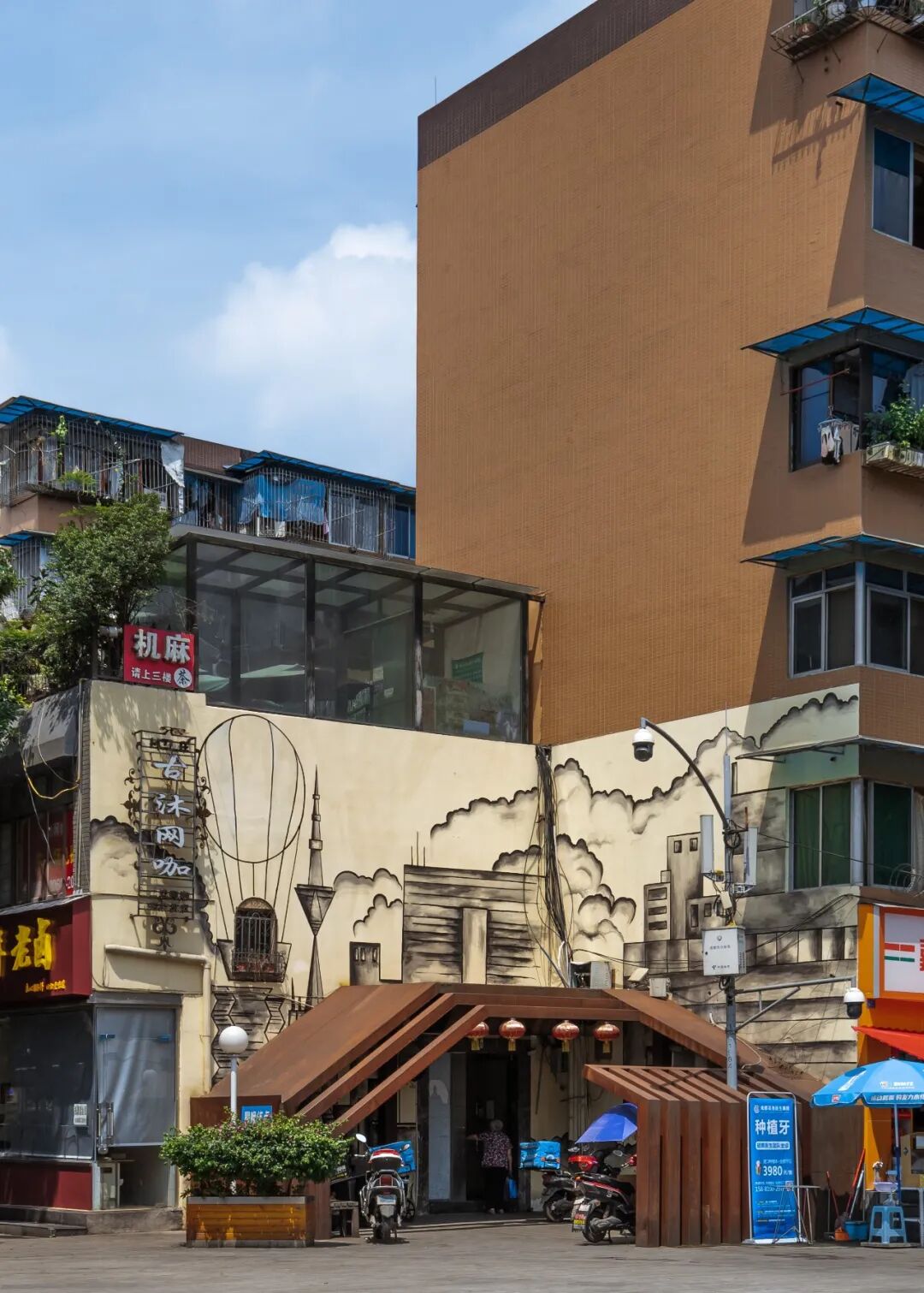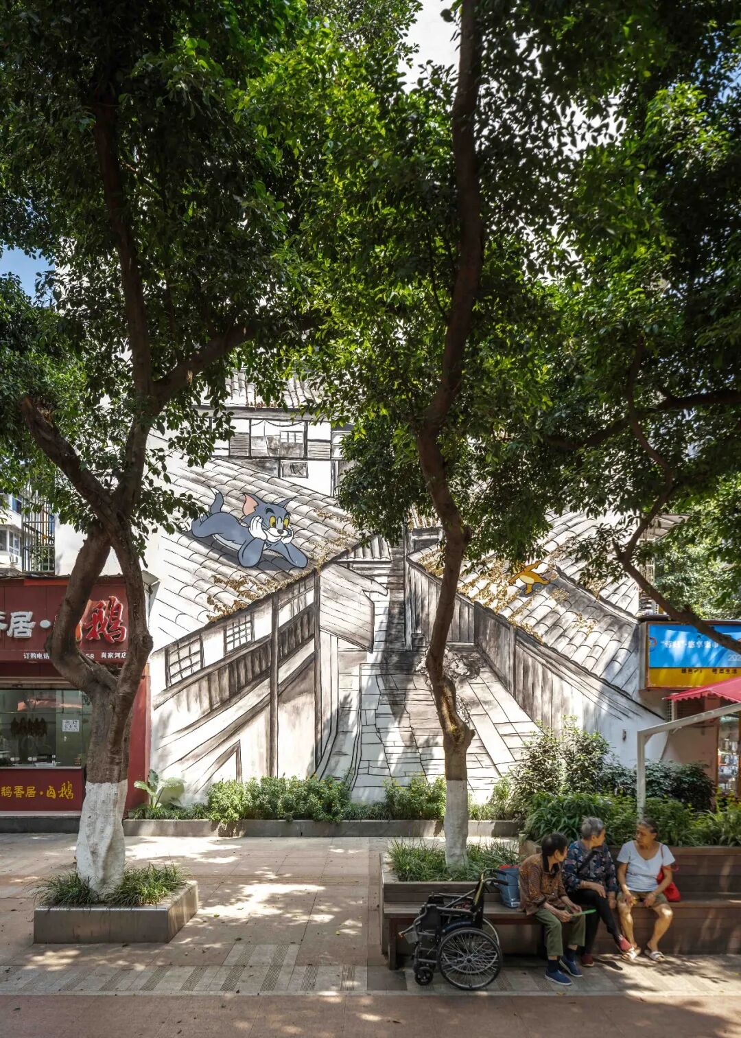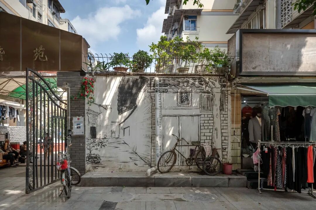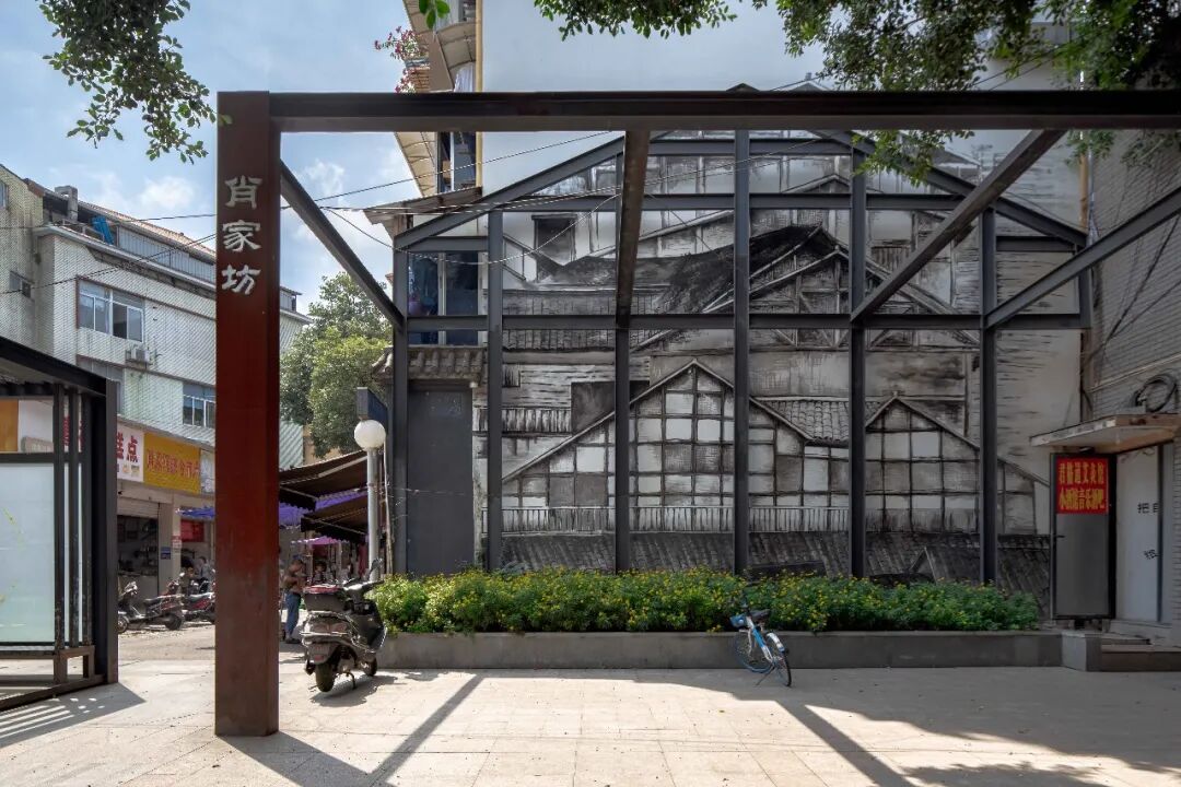 墙绘总体以川西民居为主题,色调与肖家河本有的建筑风貌保持一致。或者以简单的砖墙纹路修补已经破损的墙体,还有的地方从视觉上营造具有纵深感的空间,延伸人的视点,为街道风景营造具有戏剧般的效果。与成都过去的文化对话的同时,在不同主题空间,墙绘也纳入当地生活的元素:车来车往的形式,接送孩子的情景……让原本枯燥的墙面不再单调乏味。