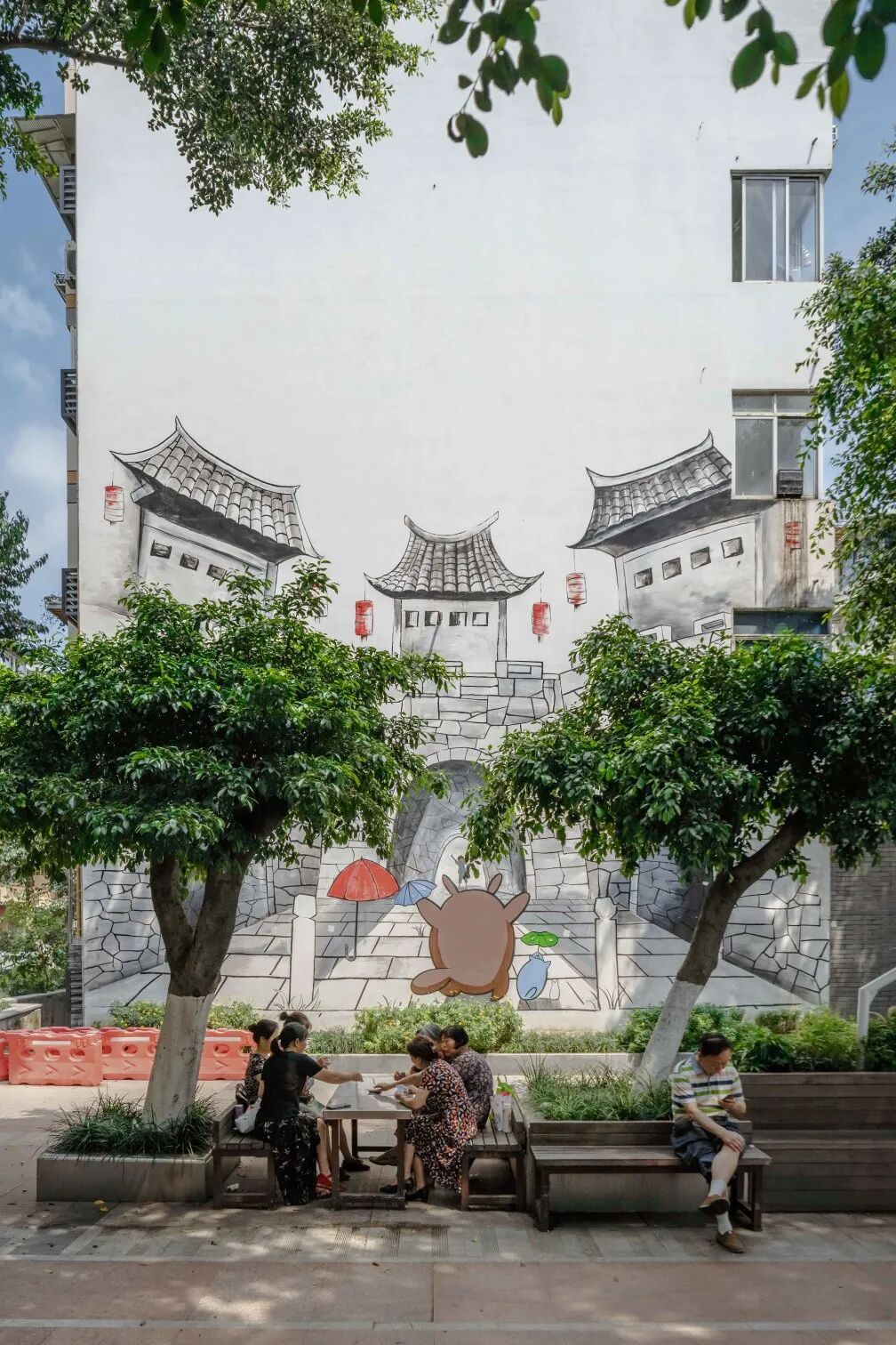 或利用街道墙体角落空间,或在小广场上增设具有自然气息、开放式座位,或设计一个半开放式的空间,将老年人下棋、喝茶的空间与跳坝坝舞的嬢嬢们做一个小区分。