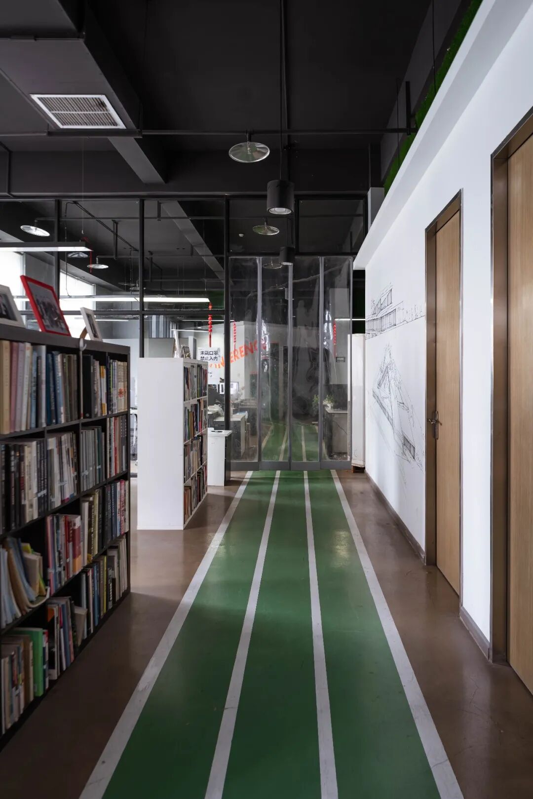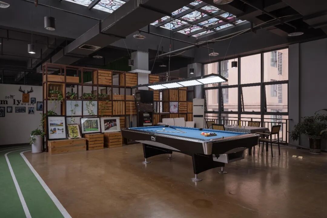 相比时下突然涌现的新鲜建筑事务所,智领名见稍显年长,但他们的办公室可不沉闷。出电梯后,走过一个黑色狭窄的过渡空间,首先迎接我们的是一个台球桌。这暗示了这个办公室的“玩主”心态。但玻璃天花板上贴满了教堂彩色窗花贴纸,你又觉得他们是不是有点严肃。开放式设计,用书架区分休闲区和工作间。最有意思的是,他们在地上画的一条绿色跑道,一直延伸到墙壁上,彰显着运动感的活力。各个工位以跑道为界,分散开来。
