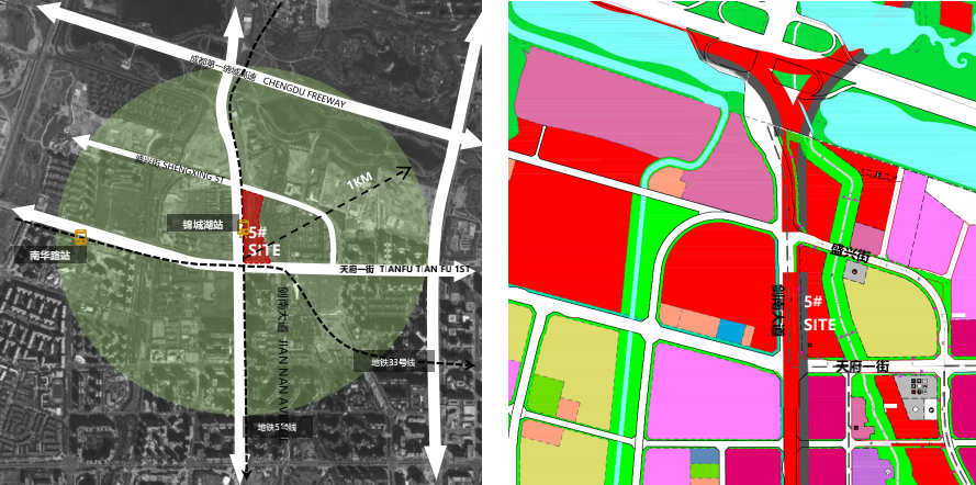瞪羚谷公园社区5号地块项目位于成都市高新区天府一街与剑南大道交汇处以东。项目东临肖家河河道,南临天府一街,北侧为瞪羚谷3#地块,西临剑南大道。地铁5号线“锦城湖”站紧临地块西侧,规划地铁33号线紧临基地南 侧。项目规划建筑建设用地面积约48.4亩。/ 图片源自智领名见