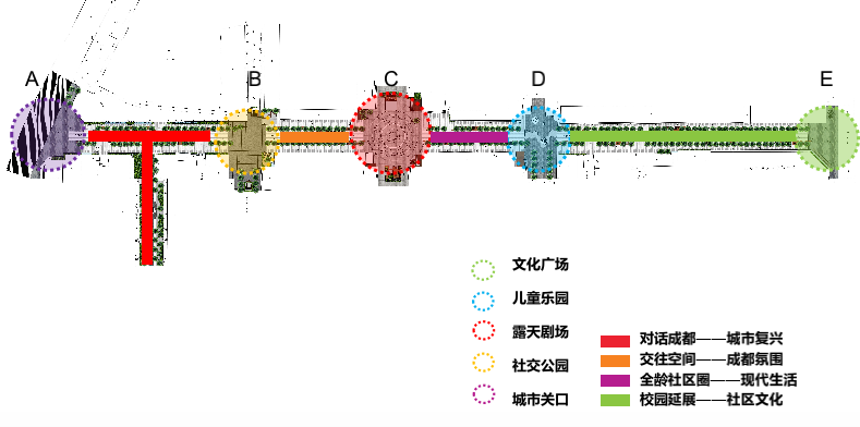 他们根据调研,将这绿化比较好的450米街道划分出9个不同的单元:城市关口、社交公园、露天剧场、儿童乐园、文化广场,复兴成都文化的地段、具有成都生活氛围的地段、具有现代生活气息的全龄社交圈,以及以校园文化为主题的社区空间。