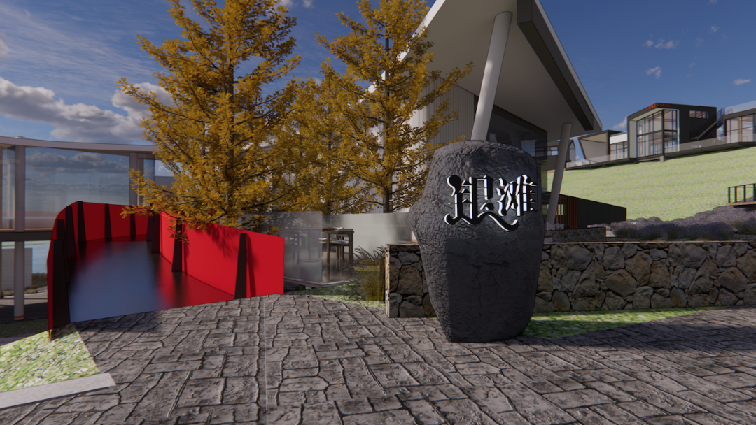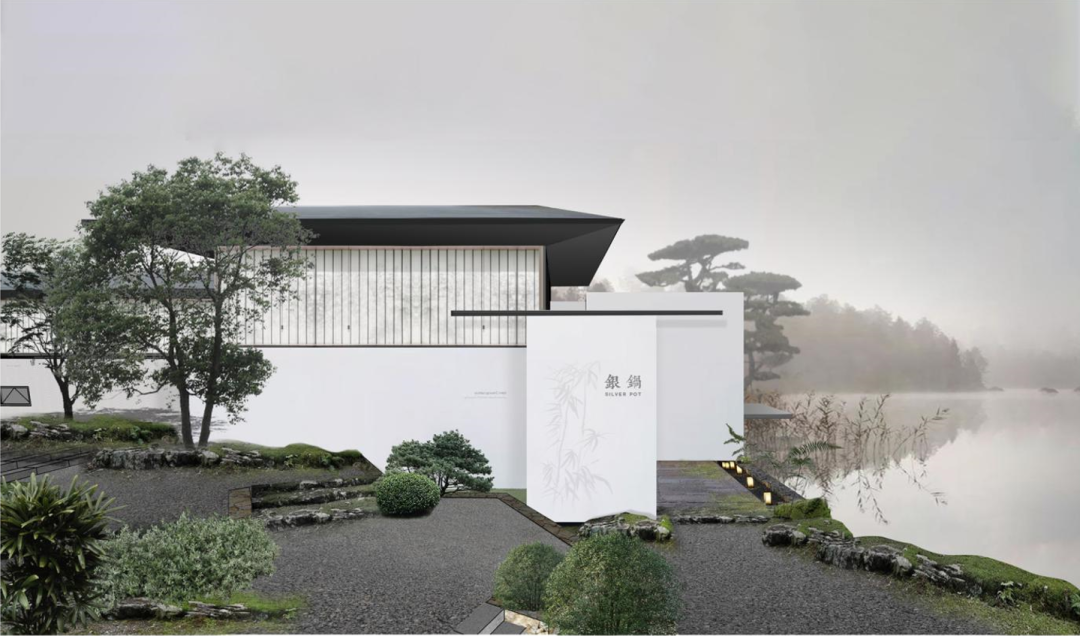设计团队将“轻舟泛湖”的理念加入其中,整体结构似一叶扁舟,简单而清新。在享受美酒的同时,与身后湖景高度融合,相得益彰。