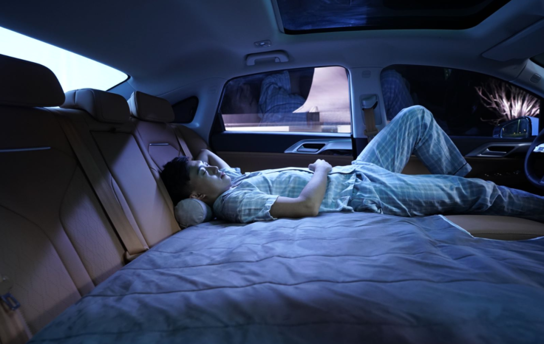 在拆下头枕后,通过语音/大屏一键操作,主副驾座椅放倒,与后排座椅无缝对接,而为了保护隐私,进入睡眠模式后,天幕遮阳帘会自动拉上,大屏屏幕亮度调暗,播放助眠轻音乐,搭配提供的优质睡眠套装,躺在车里,有胜过躺在床上的舒适感。
