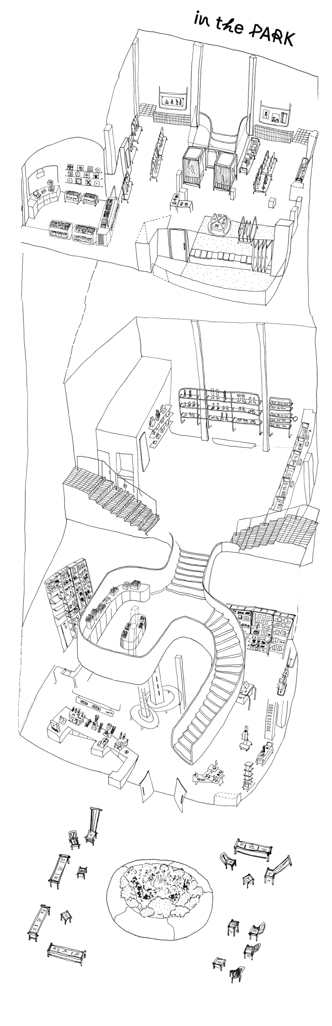 如我们所见,in the PARK店内的晾衣杆、路牌和试衣间与店外的围树椅的设计灵感,都来源于老上海的日常景观和市民公园的场景。