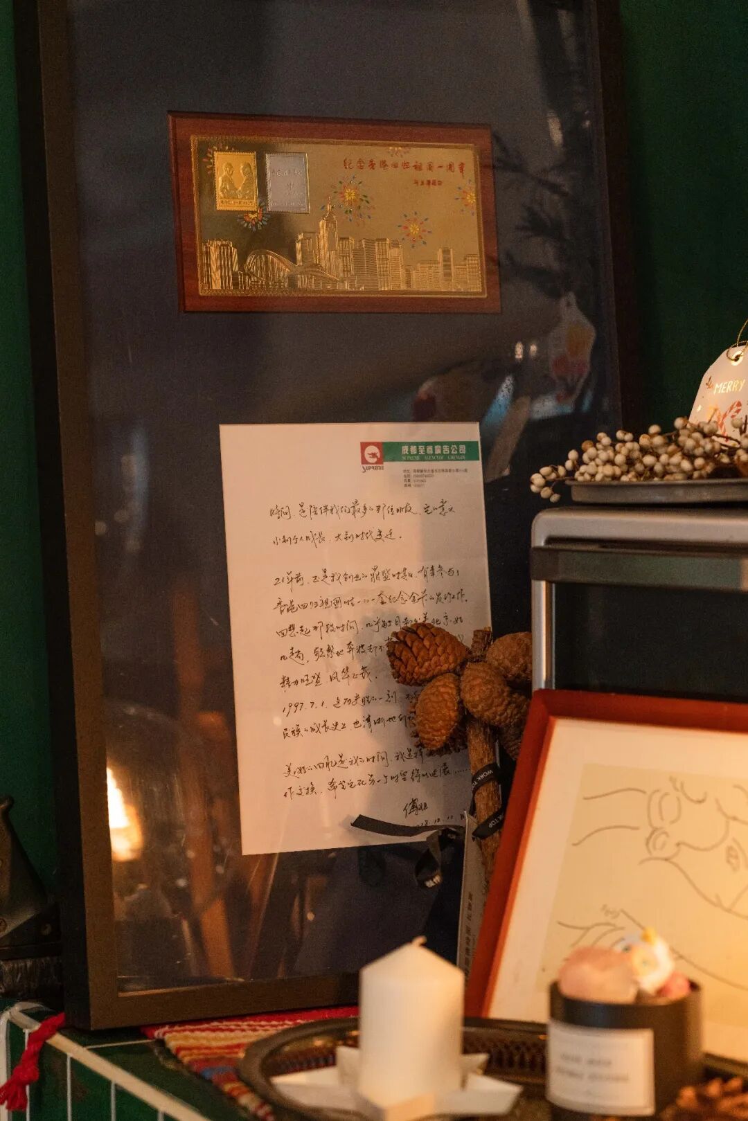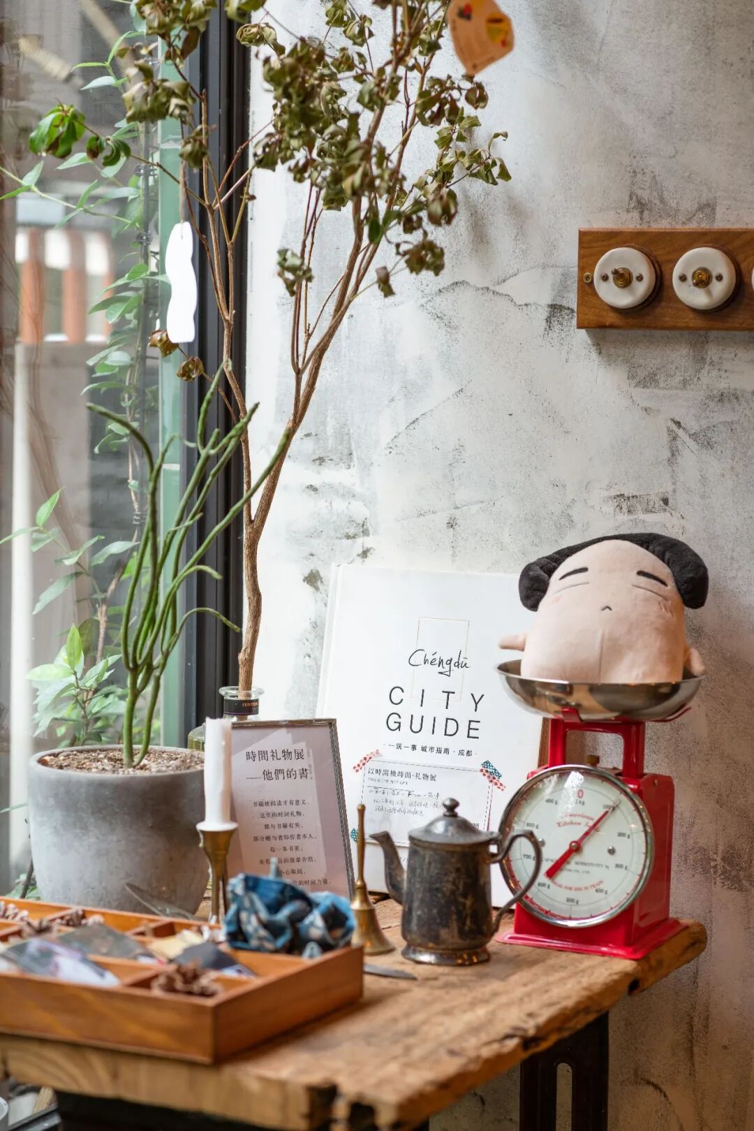 于是,店里出现了许多“有故事”的物件:一筑一事出版的第一本城市指南《成都》;人生中第一次说走就走的旅行车票;香港回归庆典的纪念邮票;开心麻花在成都首演《乌龙山伯爵》的道具;西点主厨人生的第一个烤箱;攒了10多年的电影票根;一幅没来得及送出去的兔子画……这些有意义的东西填充进来之后,空间多了更多生命力。