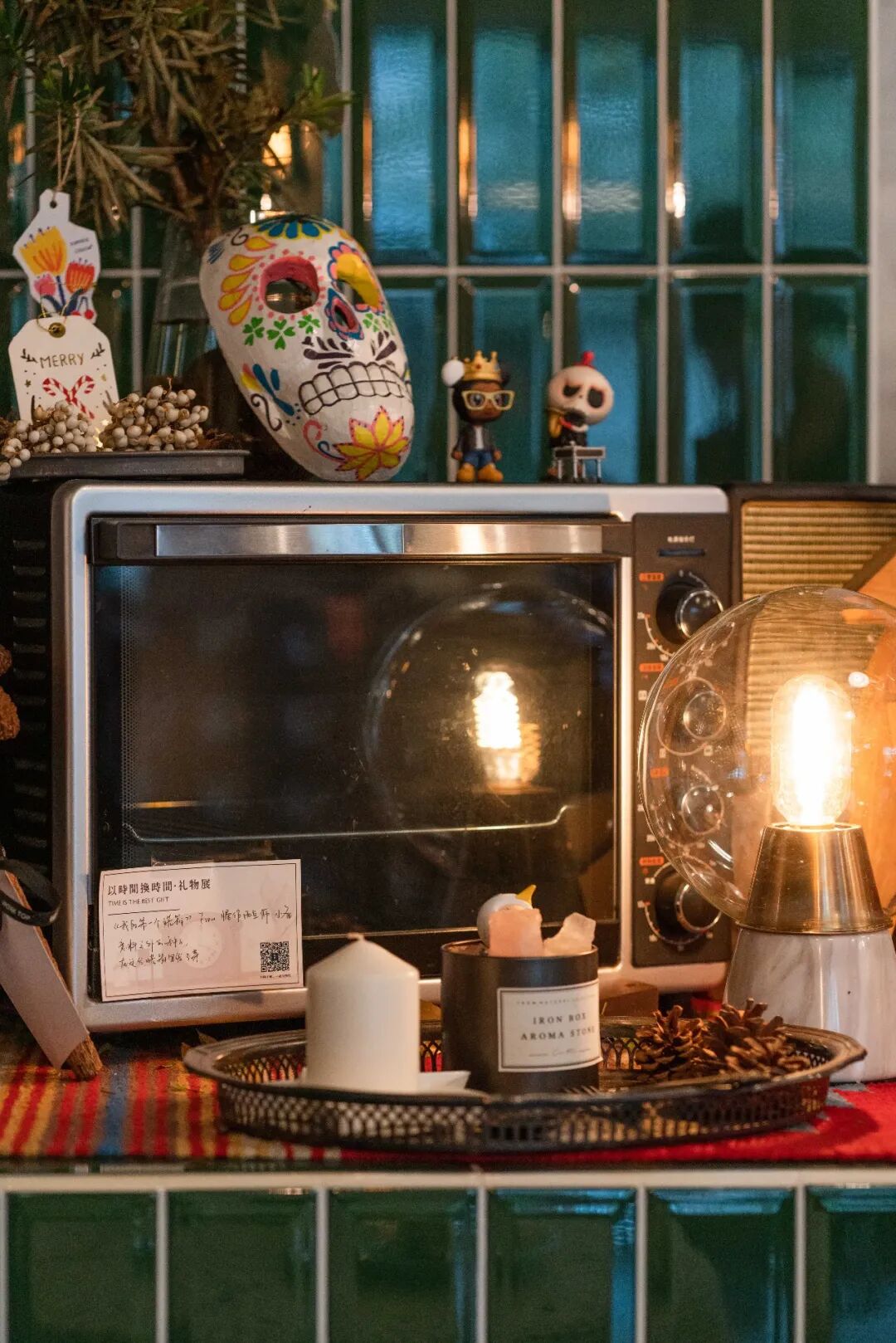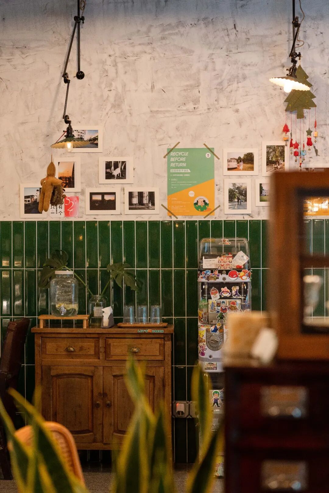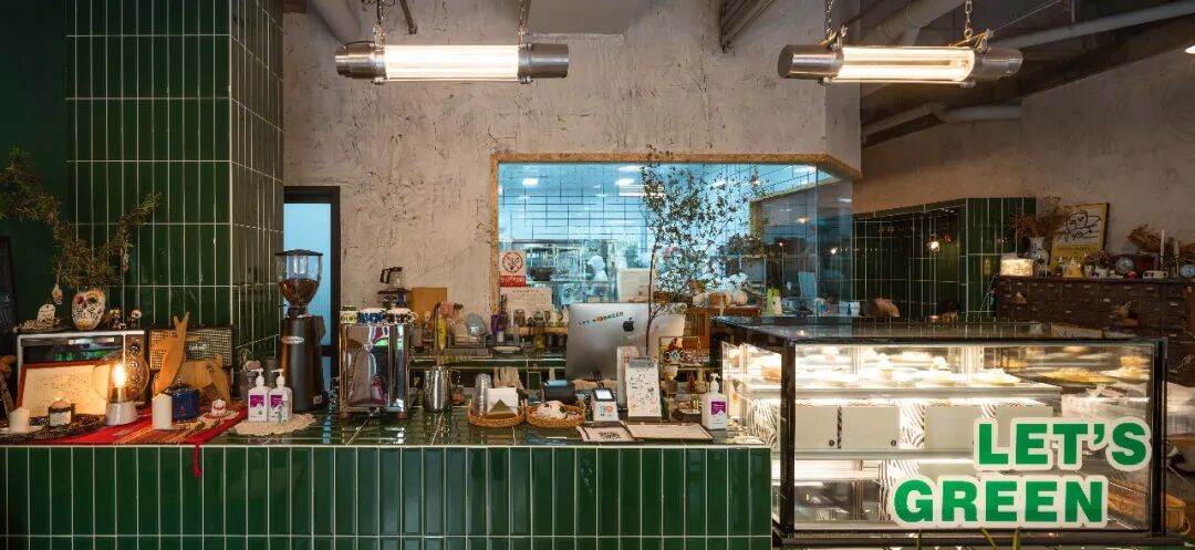 为了让店内空间更接近生活状态,硬软装也尽可能地采用了有温度的设计和物件。柜台的绿色长砖是小时候家里灶台的模样,转角柜、抽屉柜等家具也是80后的儿时记忆。