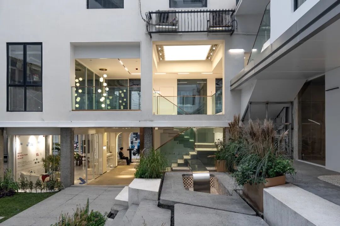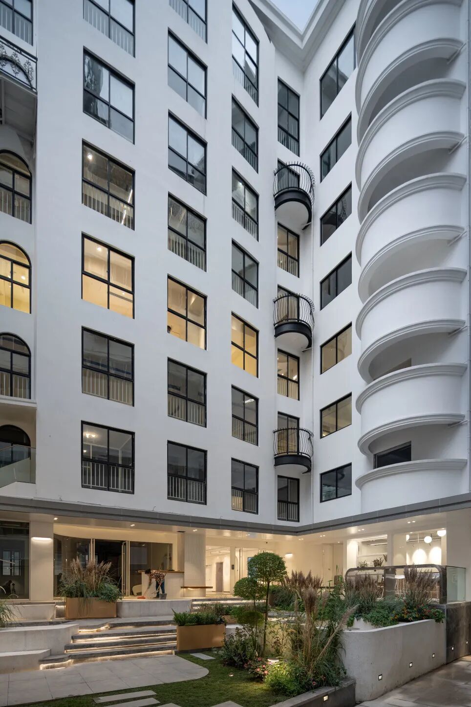 “个性”指打破了建筑的桎梏,形成明亮轻松的气氛,充满无限可能:“传承与创新”指还原建筑的历史与文化。“生命力”则体现在自然生态场景的营造上,内院层层叠叠的花园平台和屋顶独立的水景露台。每一处都配备了休闲座椅和吧台,创造出人与自然的无界空间 。