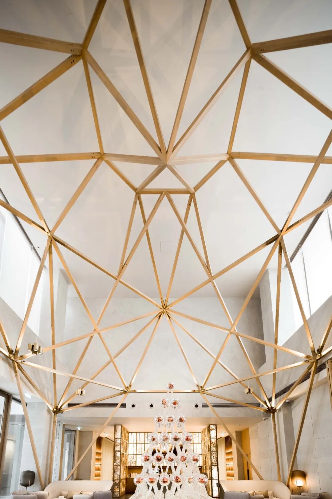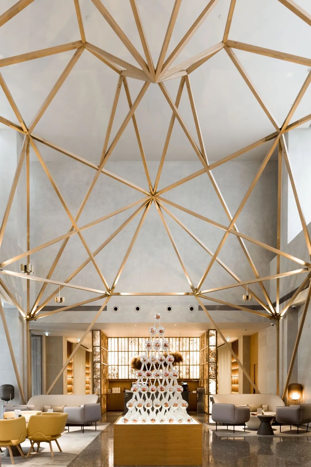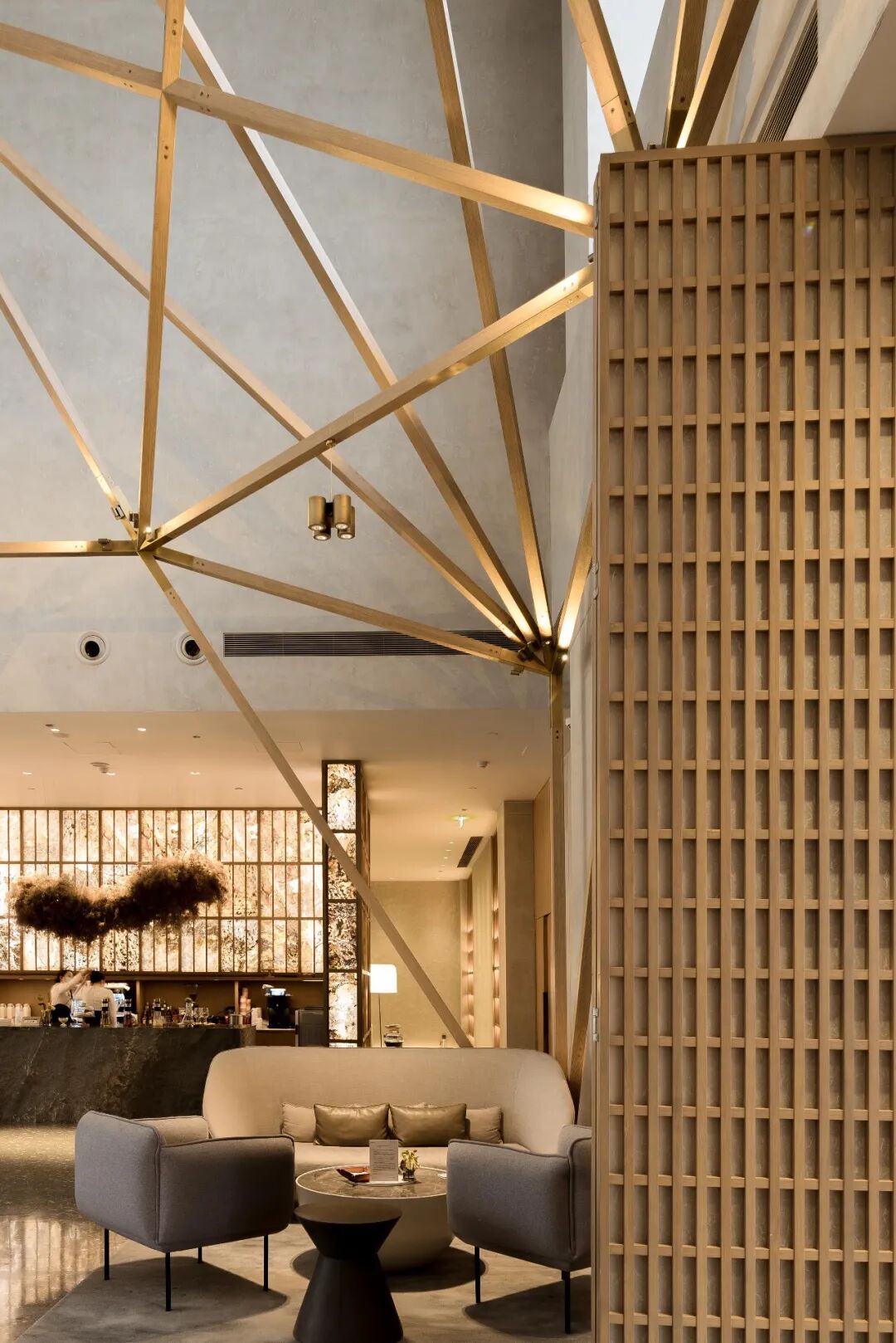 洽谈区中央的吊顶,将传统的卯榫工艺与现代空间艺术进行融合,像一个装置一般悬置空中,似乎勾勒出了时间的形态,给人超现实的神秘体验。