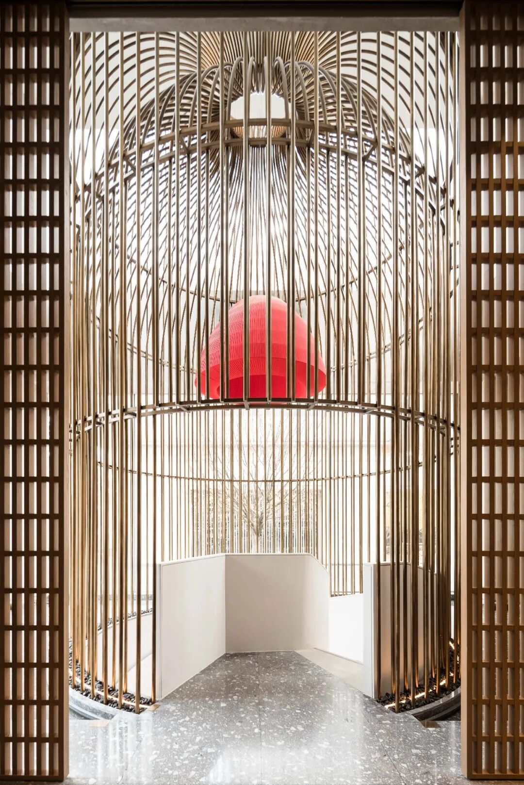 放大的鸟笼,悬挂着的“火锅”,金红相映的材质,让人联想起锦绣丝线的华美。