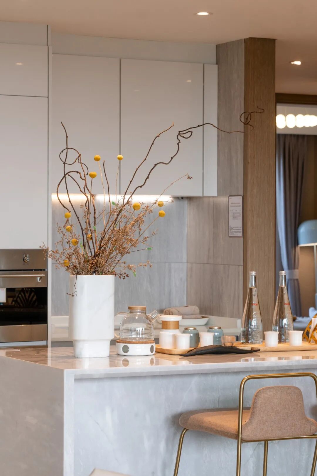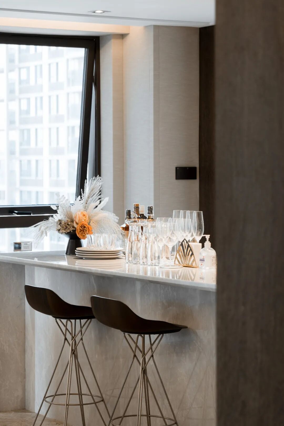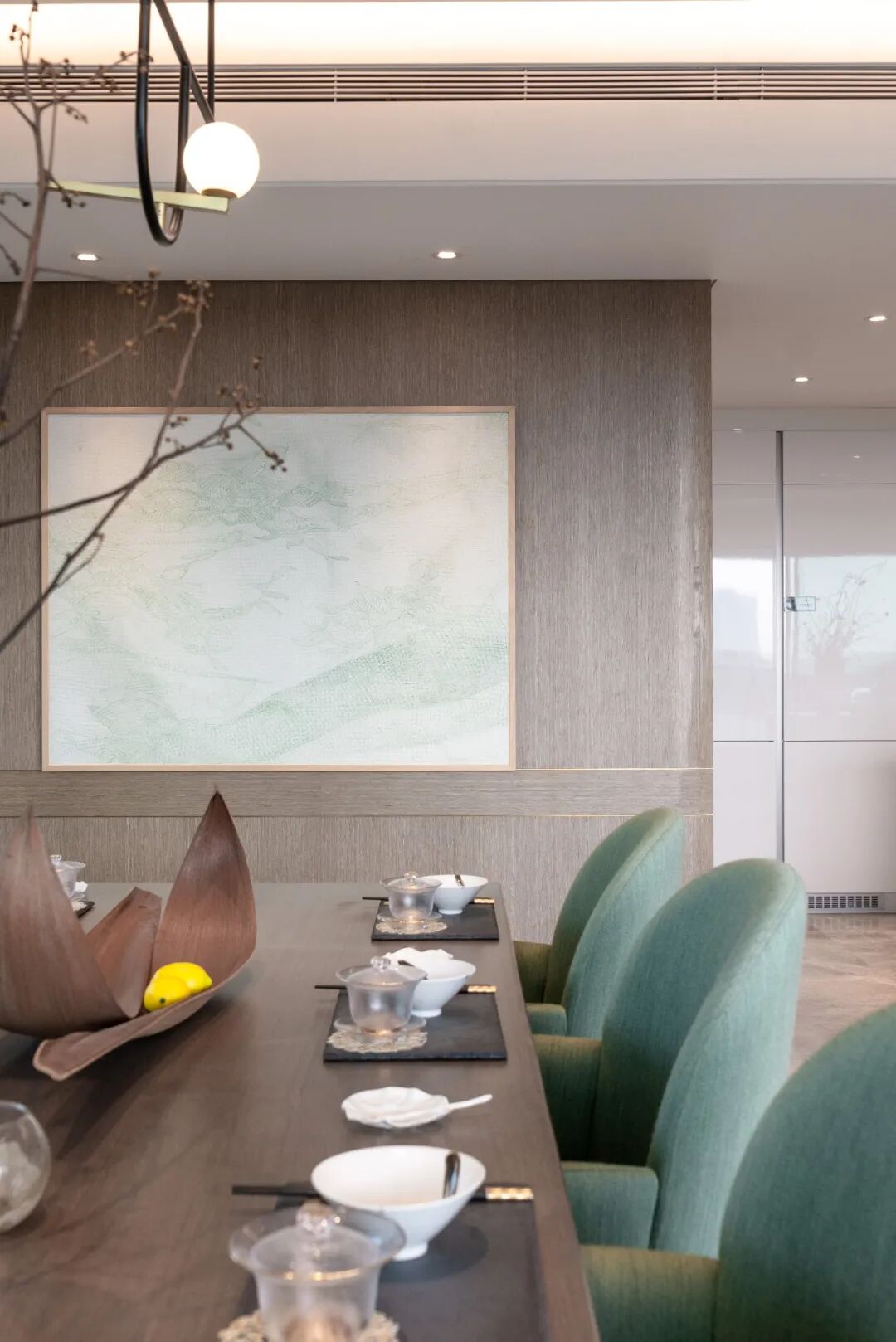 设计由北京“于舍 YU STUDIO”完成。设计师对城市意象艺术化的再造,以及细节上仿若雕刻一般的精益求精,呈现了一个具有东方美学的空间。
