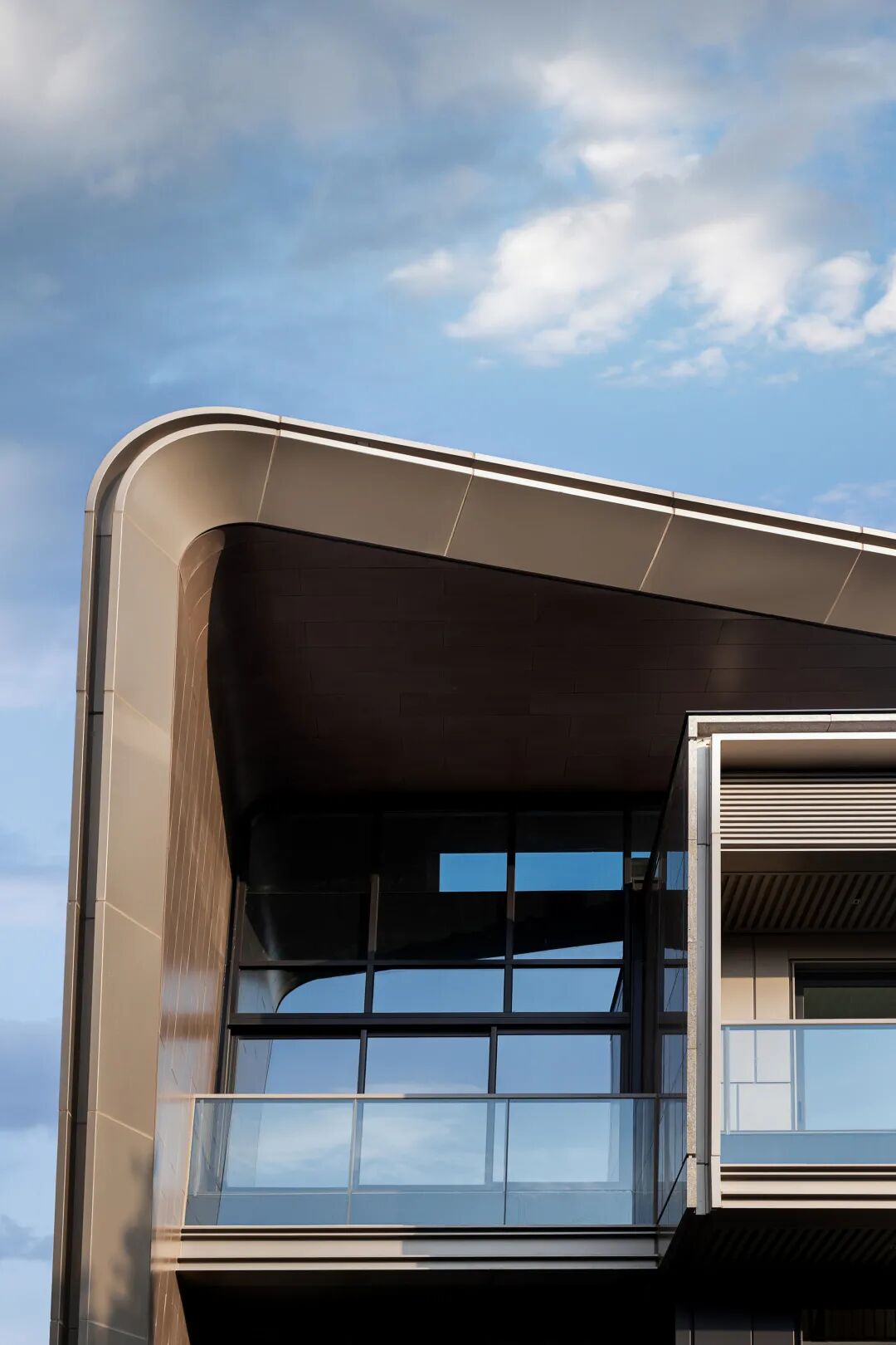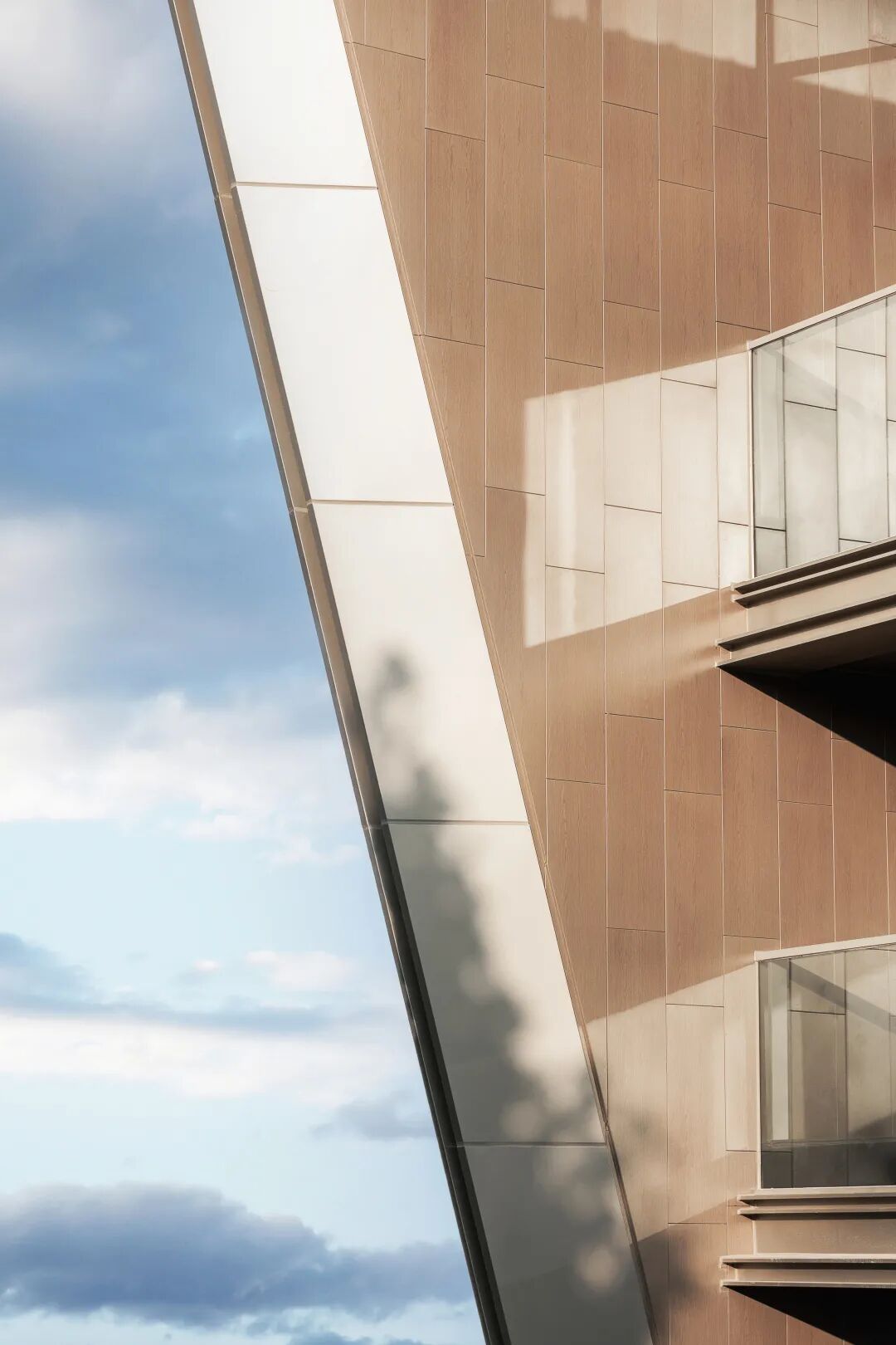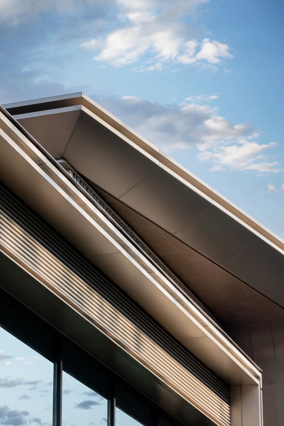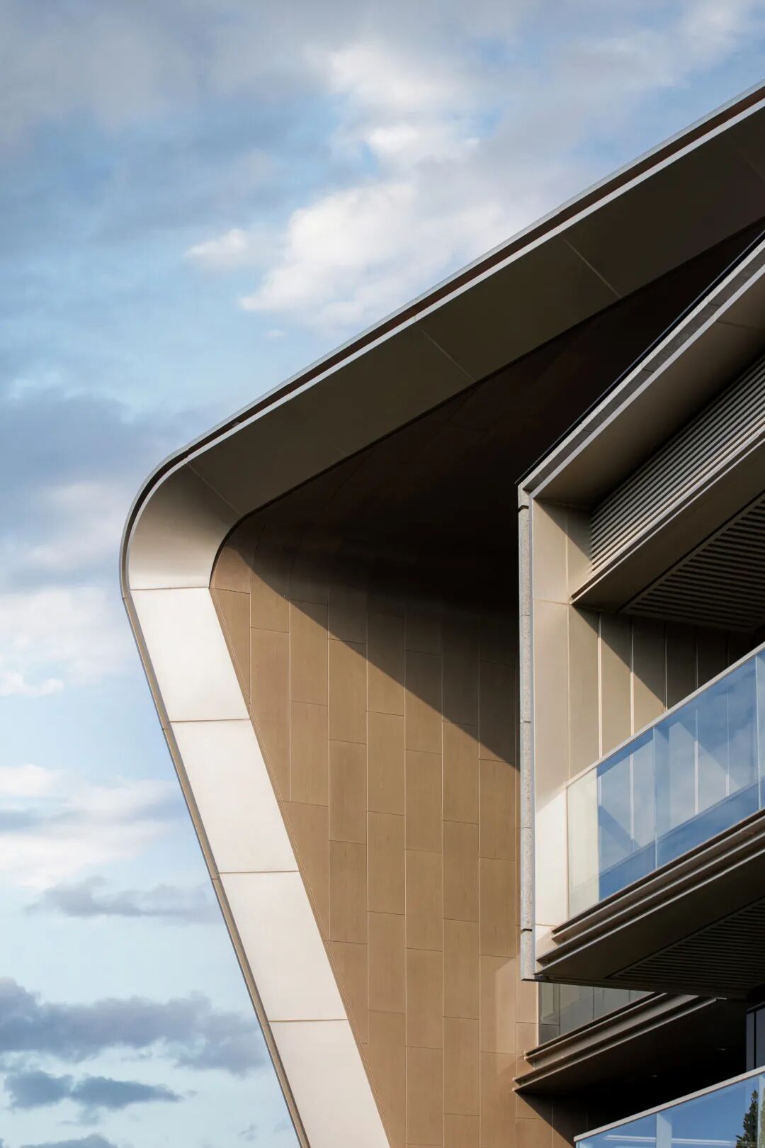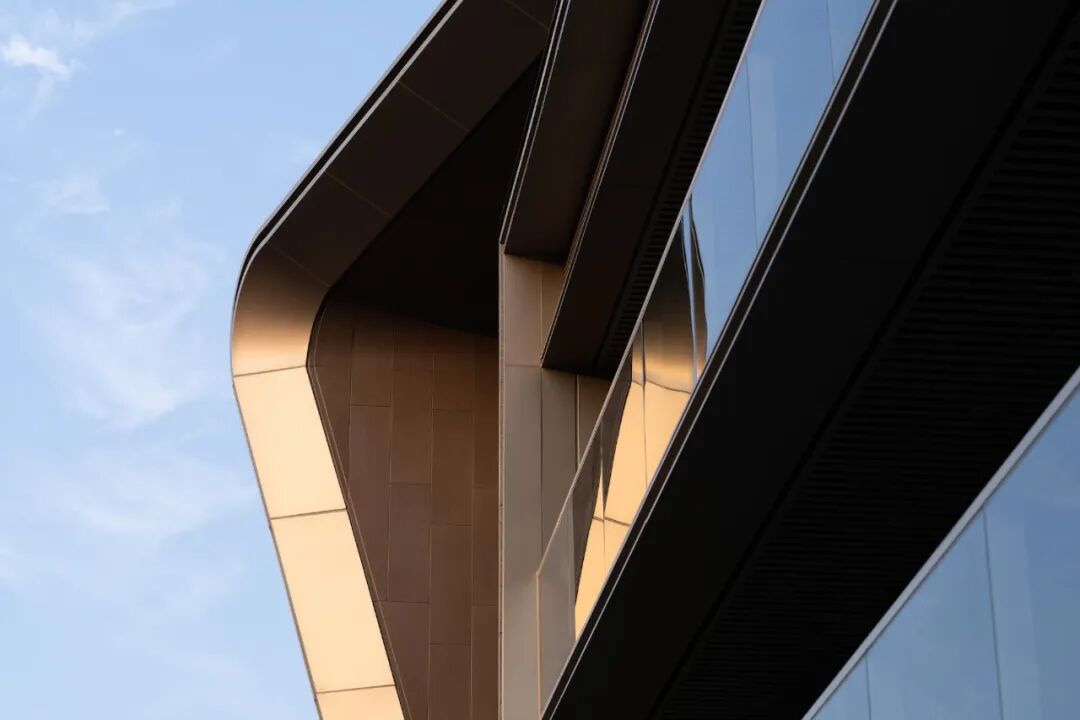 冷香槟色铝板在阳光下泛出金属光泽,低调却富有质感。内里的仿木纹铝板模仿自然肌理,为建筑增添了原生态气息。
