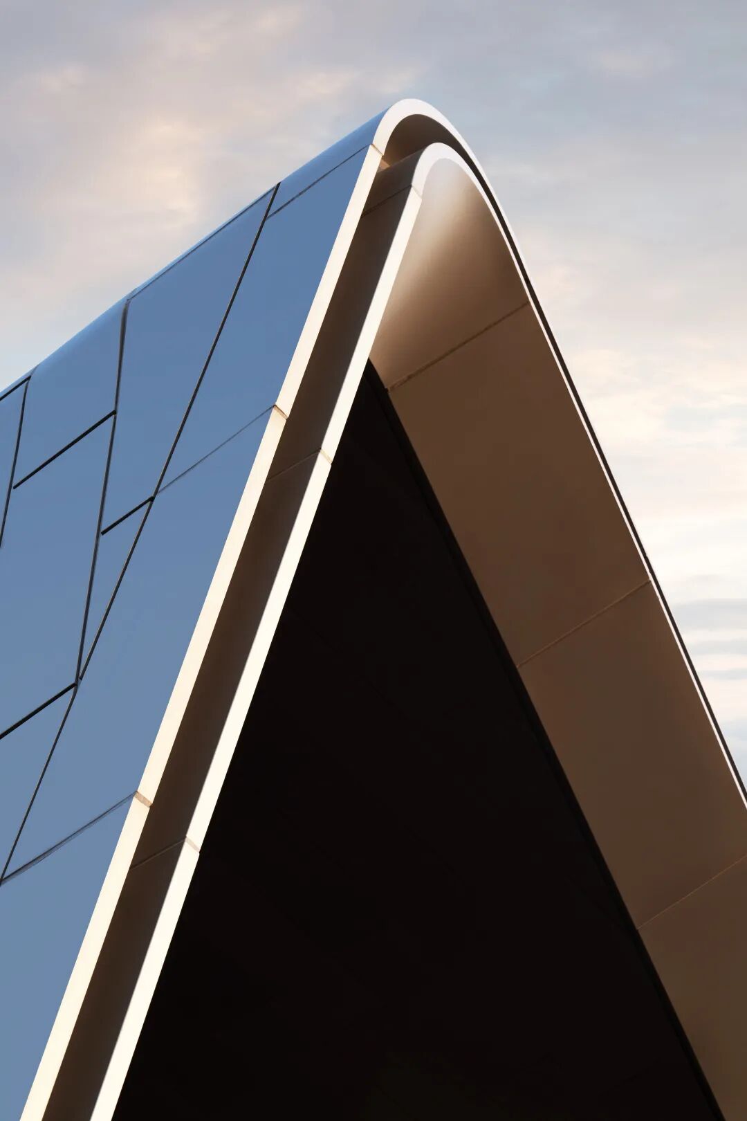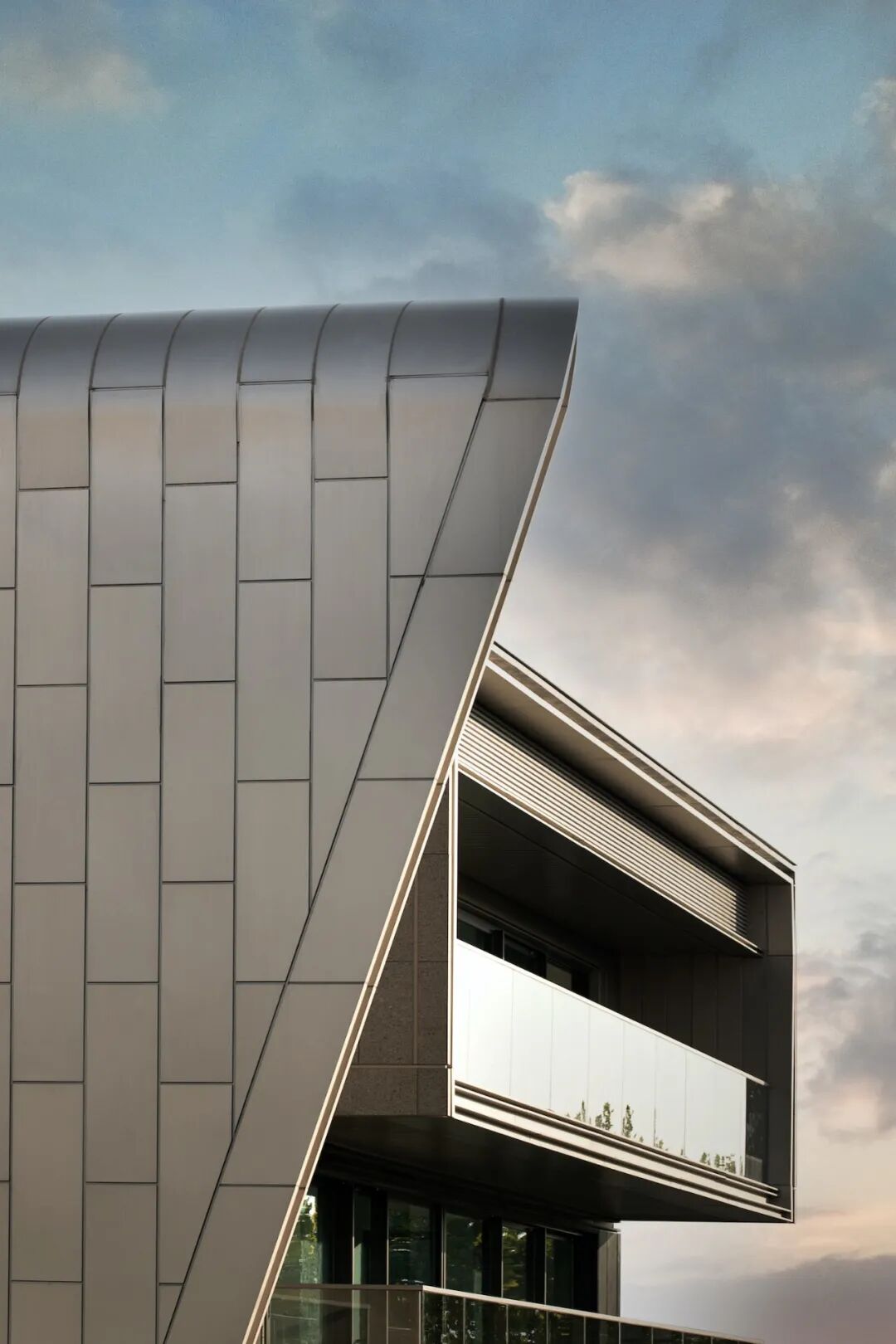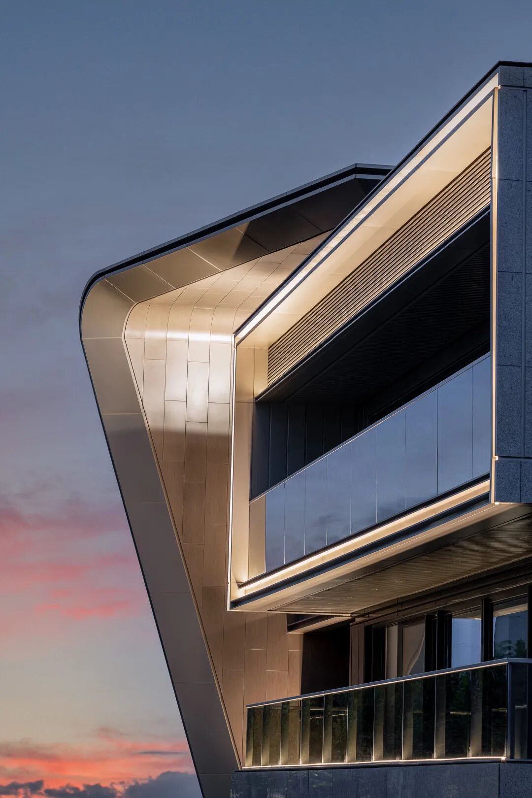当坚实有力的金属、石材与轻盈的玻璃材质有机碰撞,谱成一曲音韵跌宕的建筑交响,演绎着力量的集中和舒缓、空间的限制与拓展,为视觉和感官带来层次丰富的冲击。