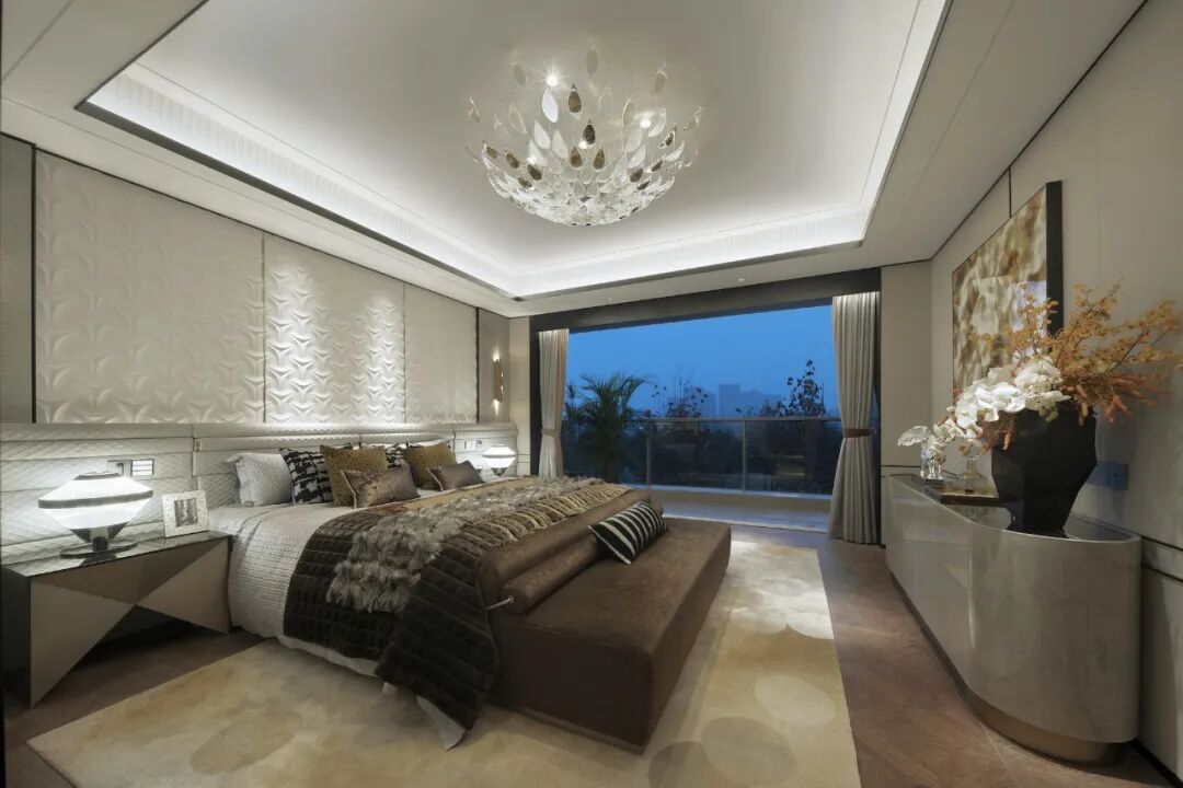 一楼起居空间开敞通明,玻璃门窗将江水、落日、星光引入室内,并以萤火般闪烁的吊灯作为陪衬。皮革块面与大理石、金属饰面的堆叠运用,让居家的日常变得优雅。