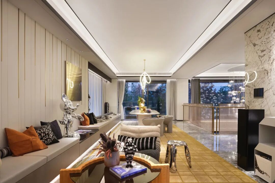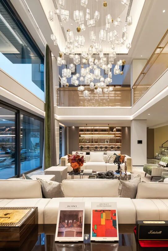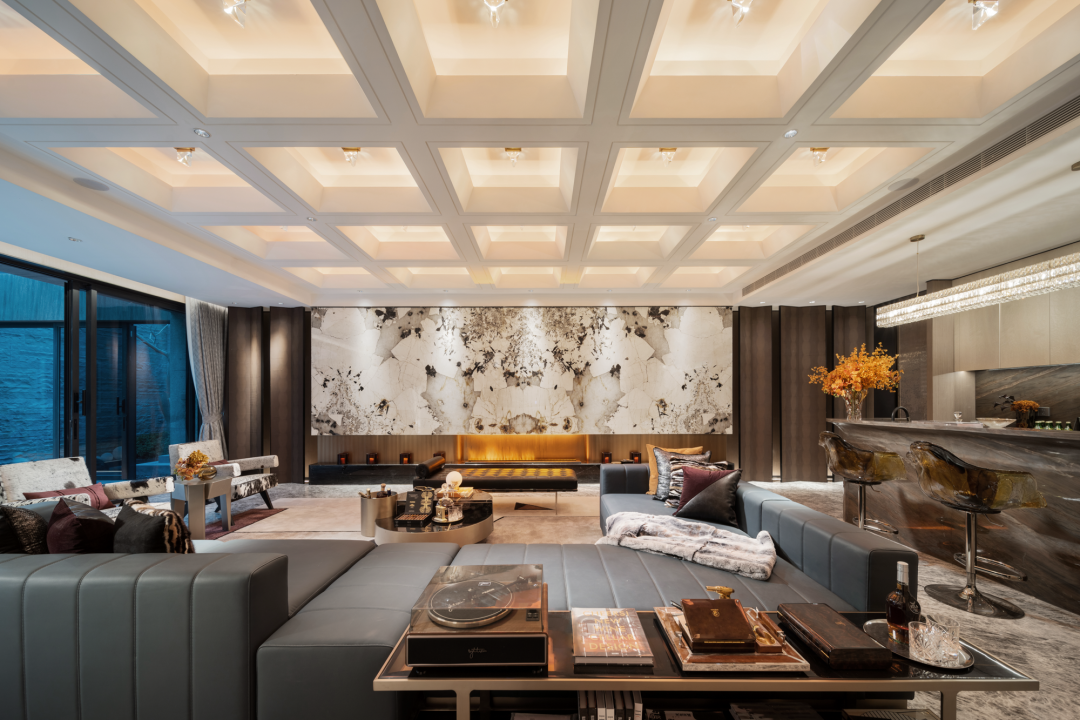影音室的几何墙饰、无主灯的星空顶,结合大围合简约沙发,让人们在这里体验一场沉浸式观影,亦或是一个举杯微醺的畅谈夜晚。