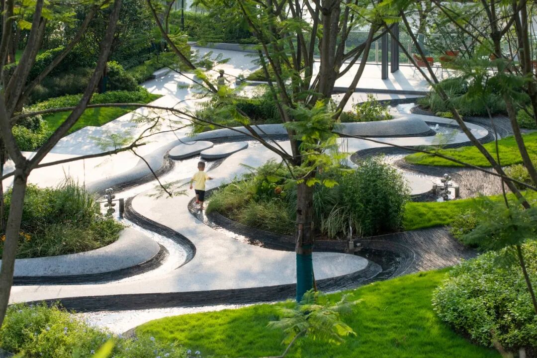 二层的“曲水流觞”是为孩子们打造的嬉水乐园。一棵棵蓝花楹茂盛挺拔地向上生长,枝杈散乱柔软。绿荫下是婉转洄游的曲水路径,可以想像孩子们光着脚嬉戏玩耍的模样。
