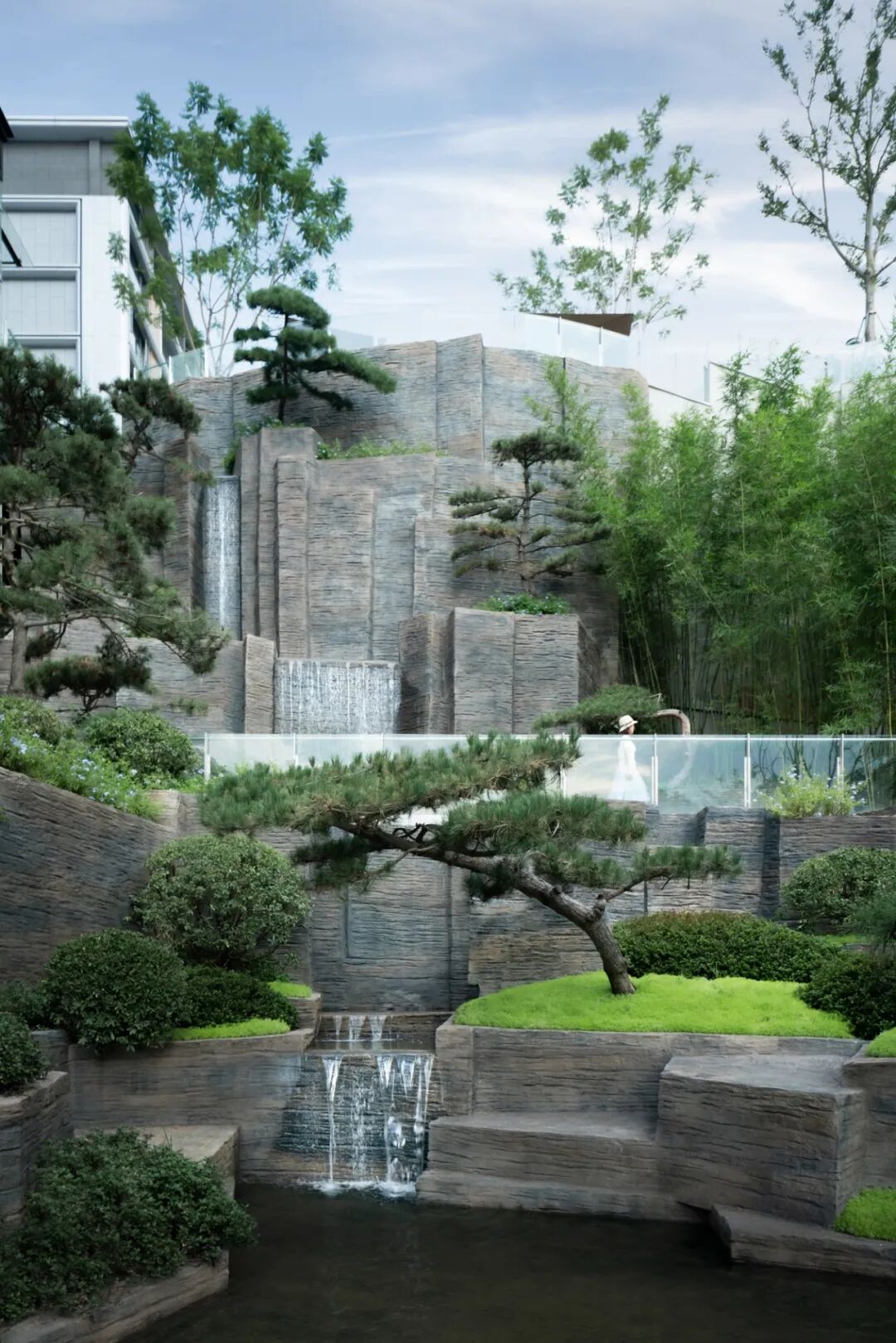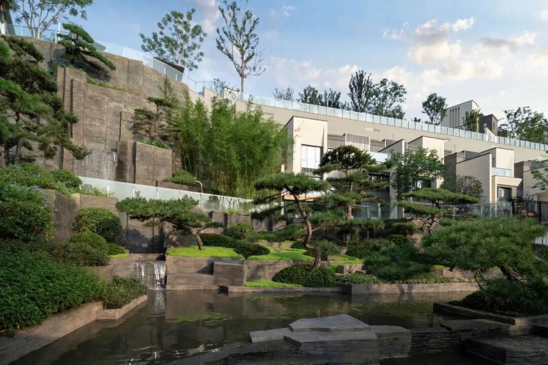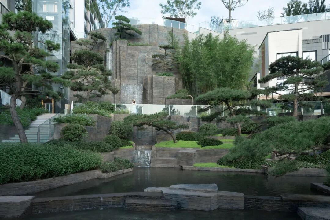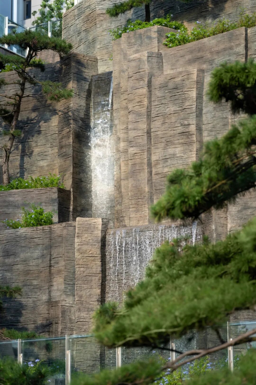 壹江郡的园林景观由美国SWA担纲设计,在高差达40米的江岸台地上,打造出由低到高的4D飞瀑园林景观。