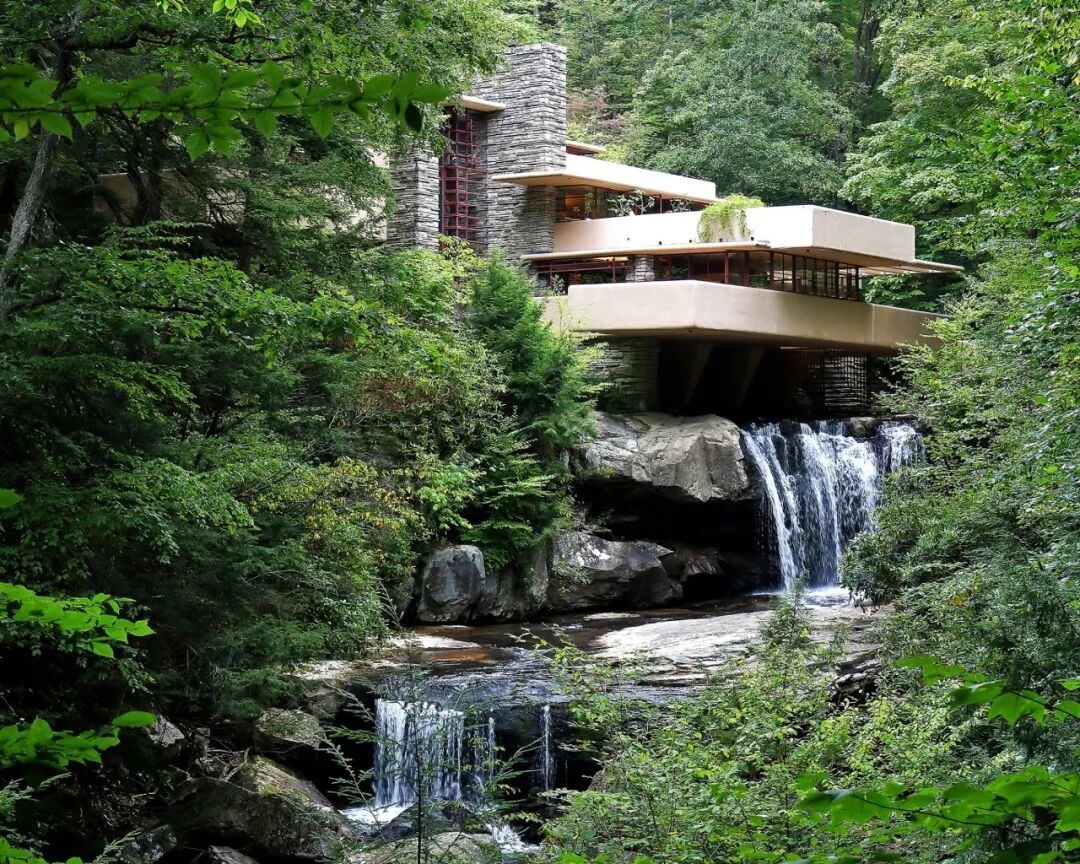 在经典作品“流水别墅”中,弗兰克·劳埃德·赖特在匹兹堡附近的熊跑溪林地设计了一处“与瀑布共生”的住宅。场地中巨大的石块被用作壁炉的打造,散落的悬崖石成为新筑石墙的一部分。流水别墅就像从石头中长出来的房子,在潺潺水声中,一年四季各有其美。图片来自网络
