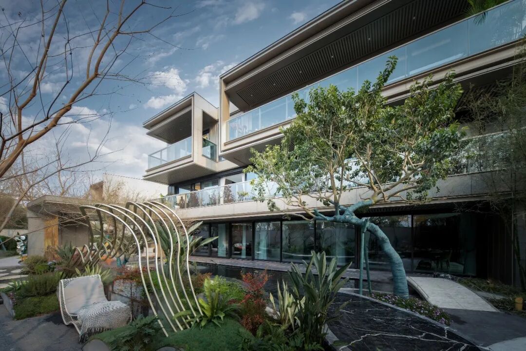 别墅外立面采用大面积玻璃门窗,将室内外连为一体,引入通透自然光线,极大地拓展了空间视野。