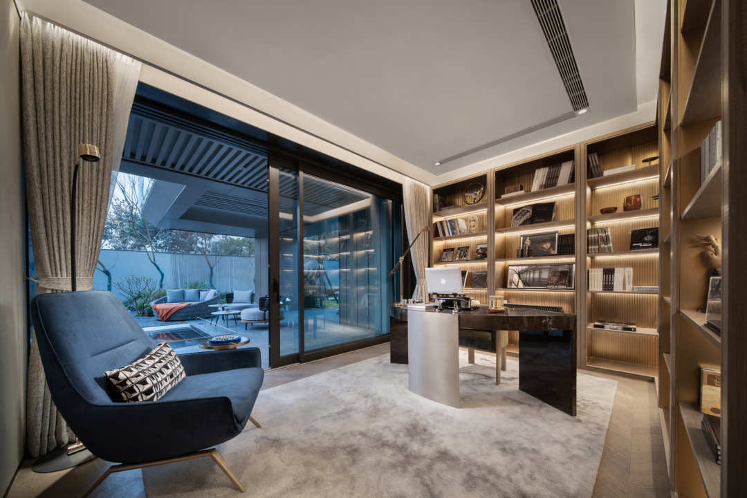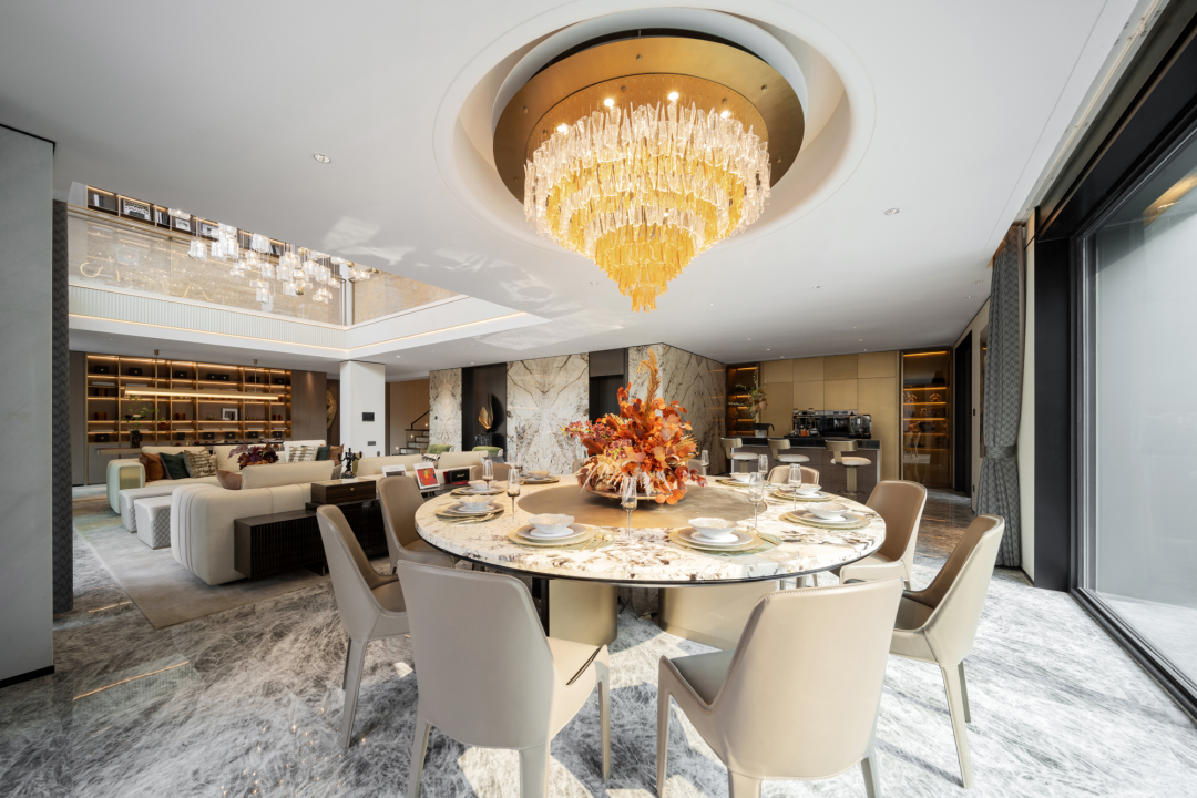 餐厅空间以奢石主导,搭配意大利进口的BONALDO餐椅,营造出别致的就餐氛围,客厅、餐厅与厨房相互流通,形成开放自由的能量场。一楼还配备了书房、茶室、户外花园等空间,满足人们多元的生活需求。